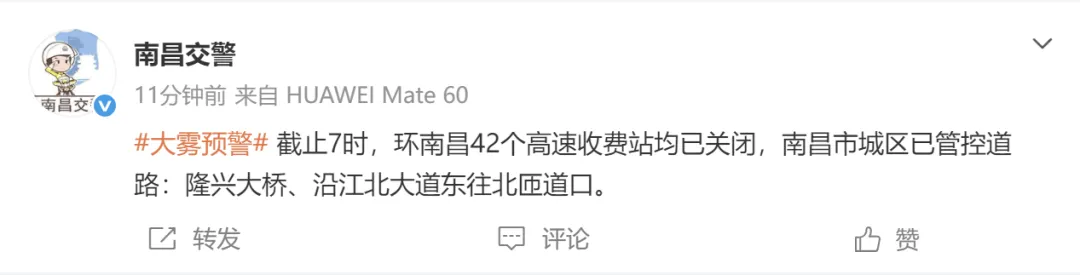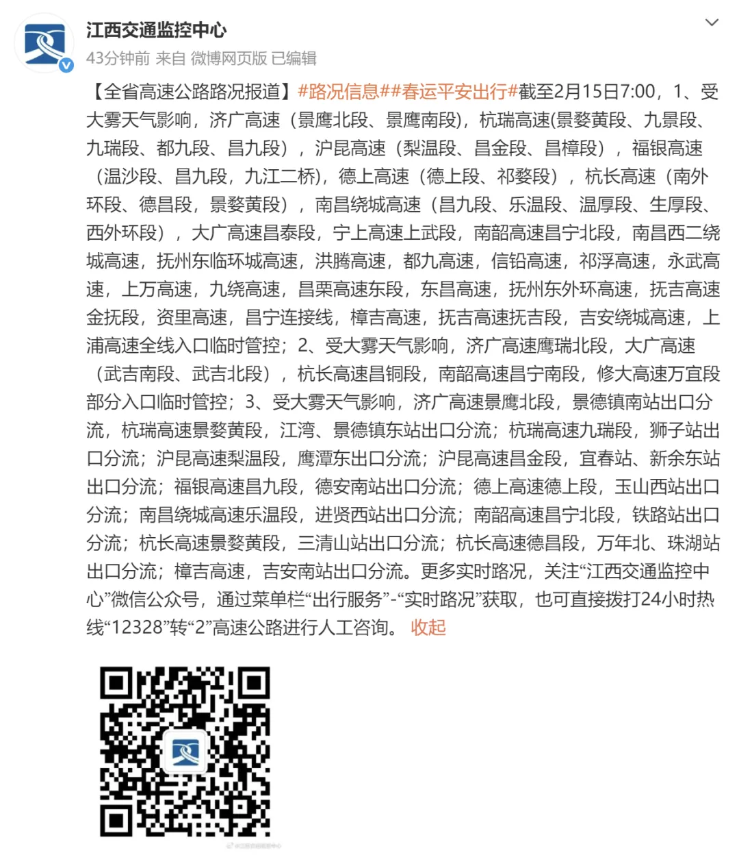 截至2月15日7:00,1、受大雾天气影响,济广高速(景鹰北段、景鹰南段),杭瑞高速(景婺黄段、九景段、九瑞段、都九段、昌九段),沪昆高速(梨温段、昌金段、昌樟段),福银高速(温沙段、昌九段,九江二桥),德上高速(德上段、祁婺段),杭长高速(南外环段、德昌段,景婺黄段),南昌绕城高速(昌九段、乐温段、温厚段、生厚段、西外环段),大广高速昌泰段,宁上高速上武段,南韶高速昌宁北段,南昌西二绕城高速,抚州东临环城高速,洪腾高速,都九高速,信铅高速,祁浮高速,永武高速,上万高速,九绕高速,昌栗高速东段,东昌高速,抚州东外环高速,抚吉高速金抚段,资里高速,昌宁连接线,樟吉高速,抚吉高速抚吉段,吉安绕城高速,上浦高速全线入口临时管控;