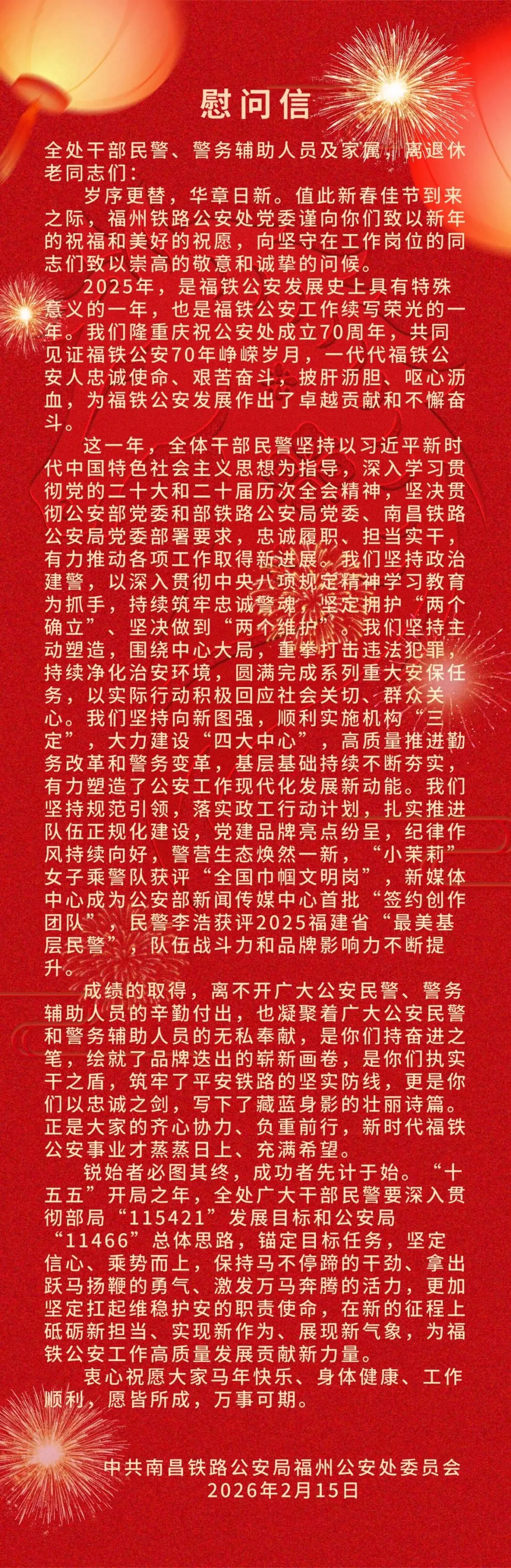 南昌铁路公安局福州公安处党委慰问信