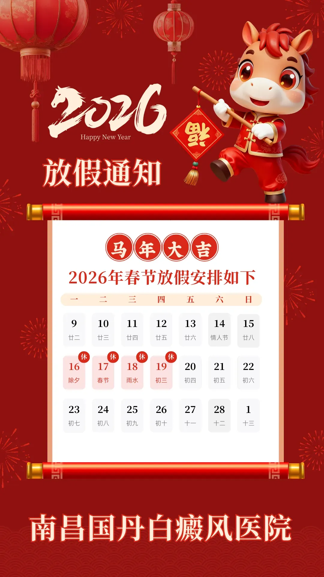 春节医院放假时间:2026年2月16日-2月19日,放假4天。