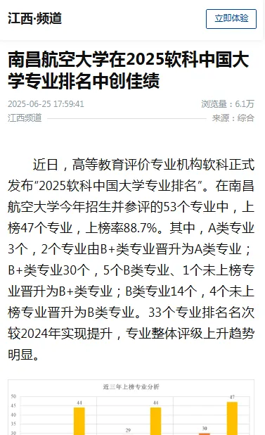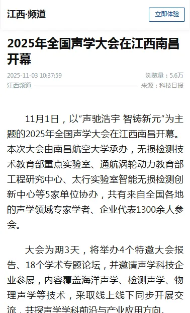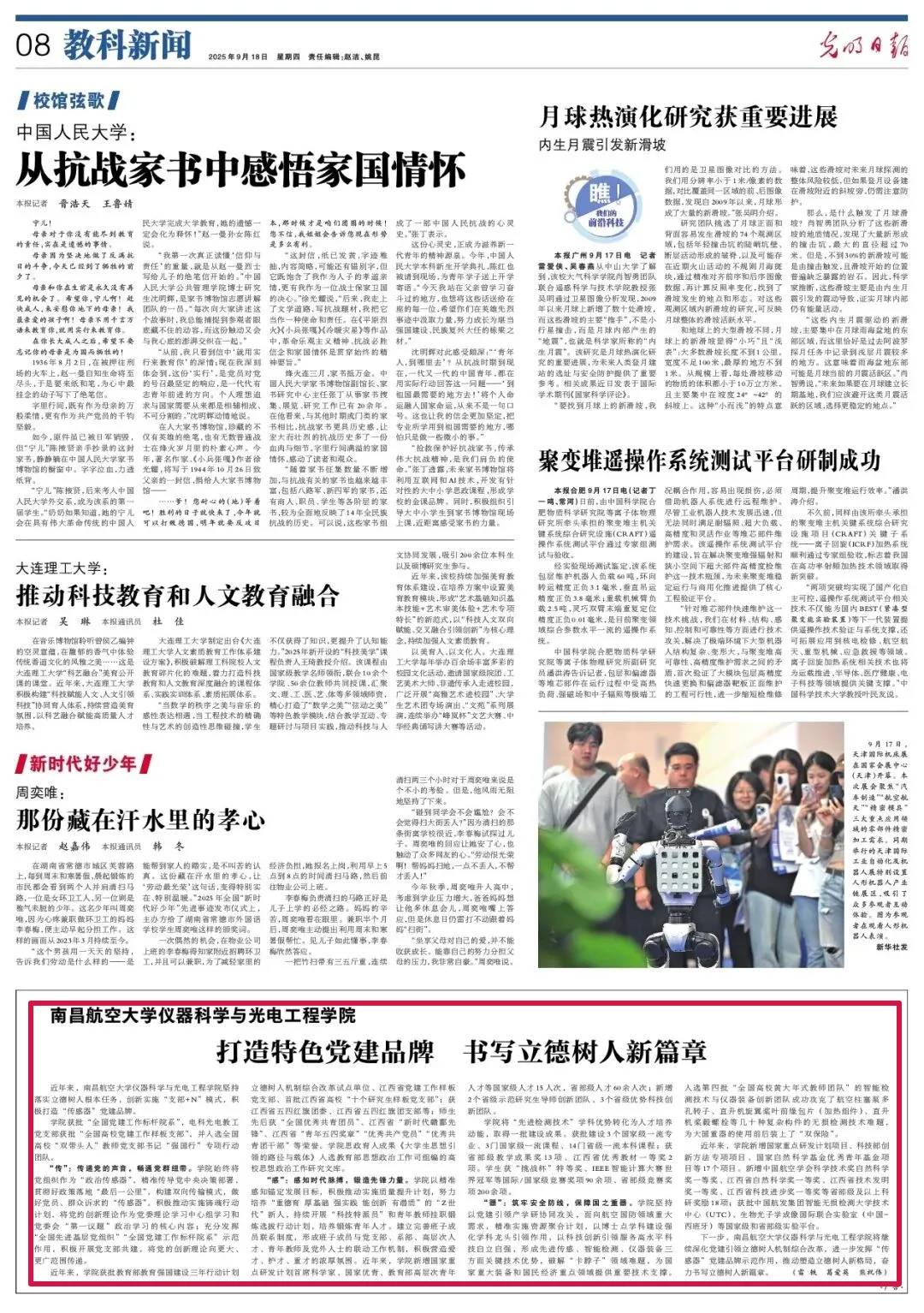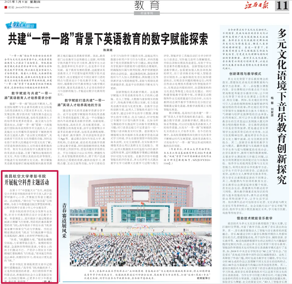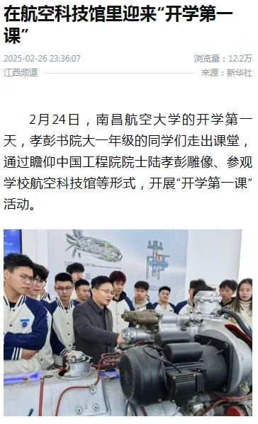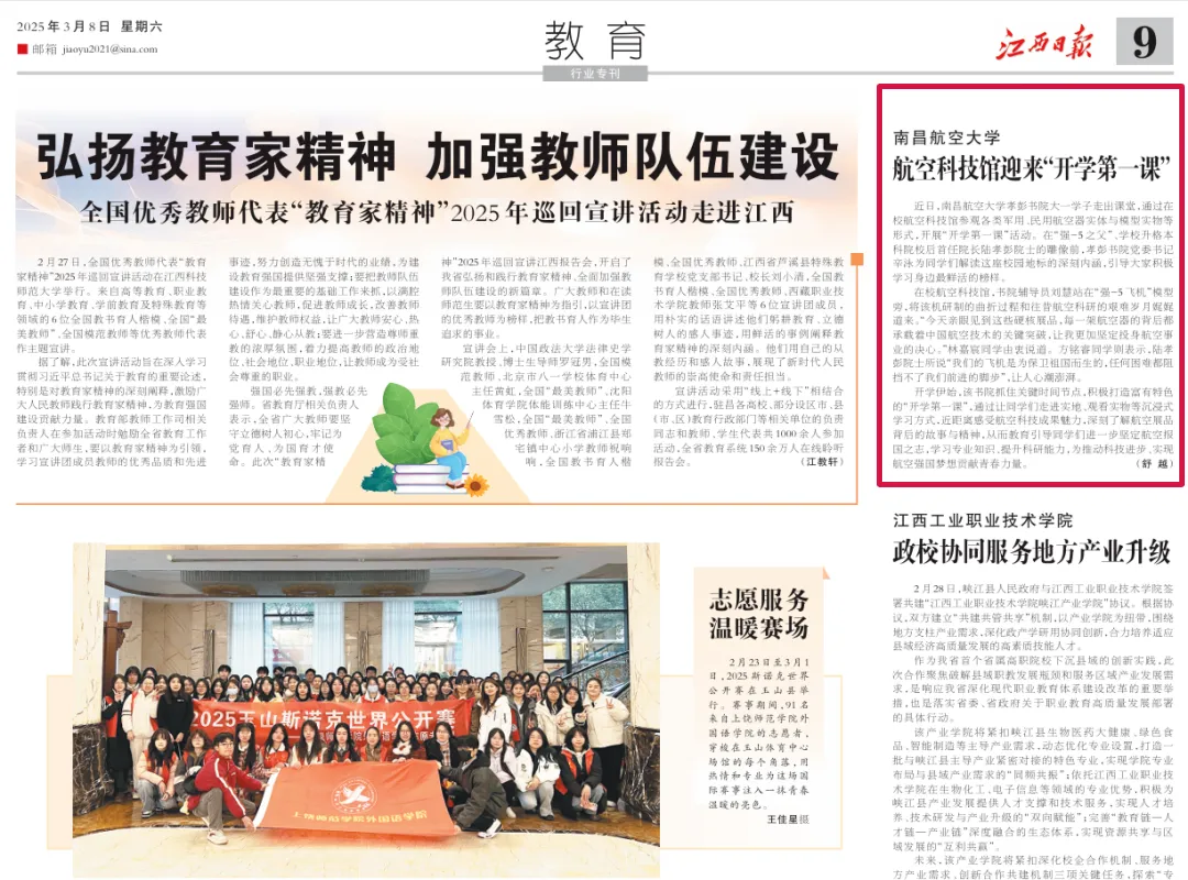 《江西日报》报道我校在航空科技馆里迎来“开学第一课”,通过沉浸式学习,使学生加深对课堂知识的理解,近距离感受航空科技的魅力,引导学生以实际行动践行航空报国、航空强国使命担当。