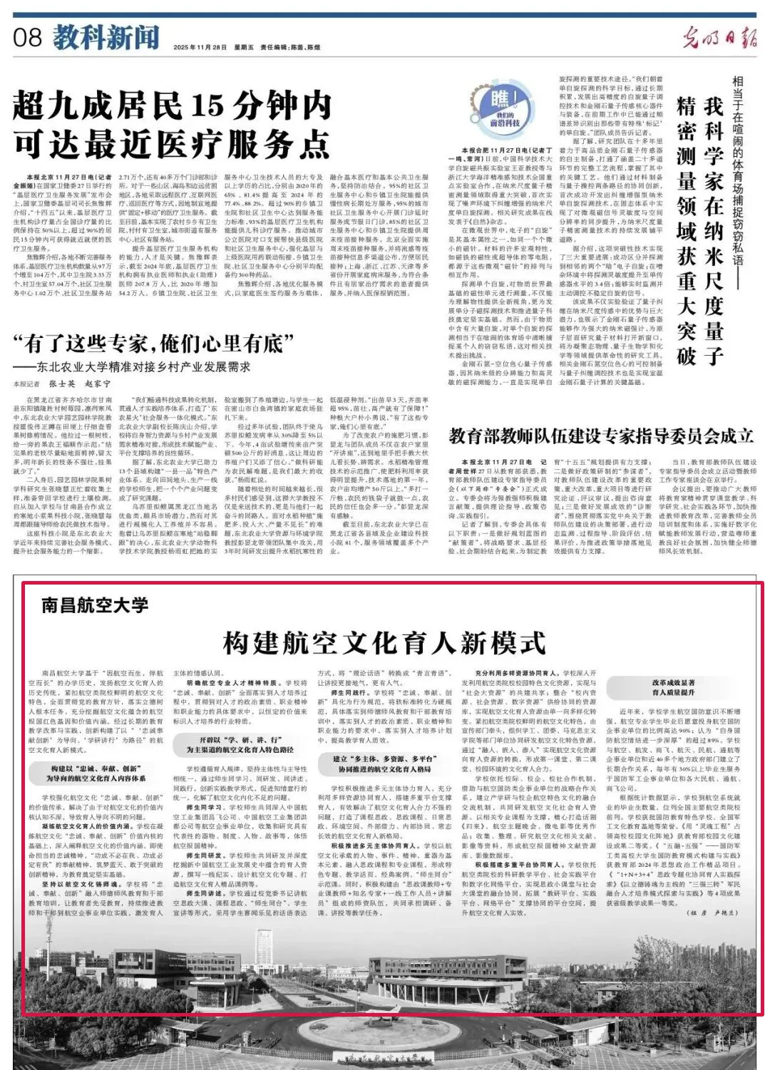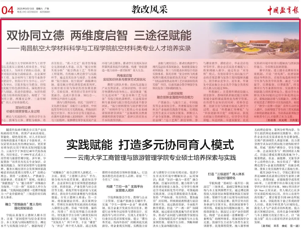 《中国教育报》报道我校材料科学与工程学院认真落实立德树人根本任务,牢记为党育人、为国育才的初心使命,紧密对接国家航空战略需求,构建了“双协同立德、两维度启智、三途径赋能”的人才培养新模式。