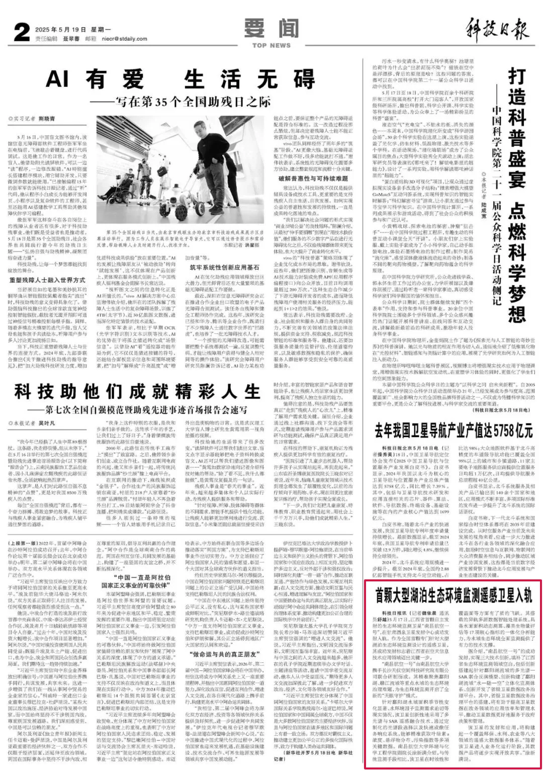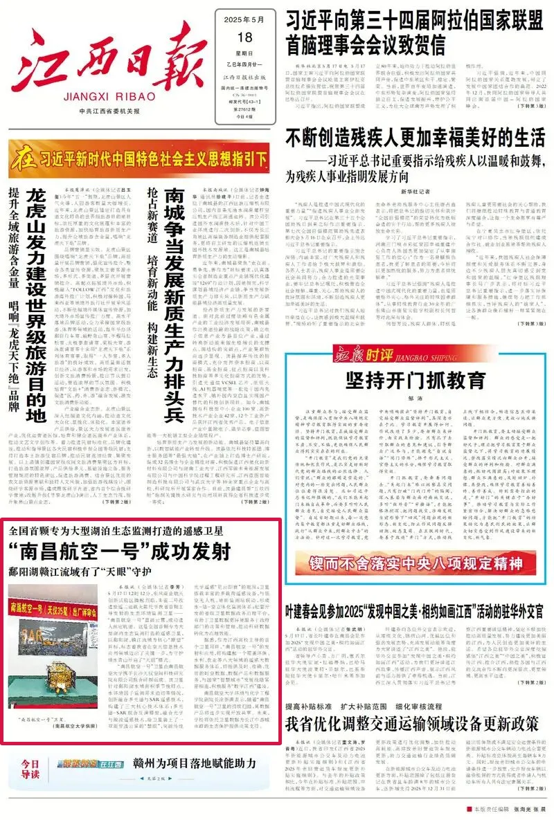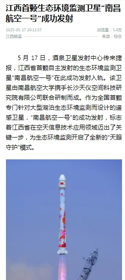 《科技日报》报道我校生态环境监测卫星“南昌航空一号”,在甘肃酒泉卫星发射中心成功发射入轨。作为全国首颗专门针对大型湖泊生态环境监测设计的遥感卫星,其成功发射标志着江西省在空天信息技术应用领域迈出关键一步。