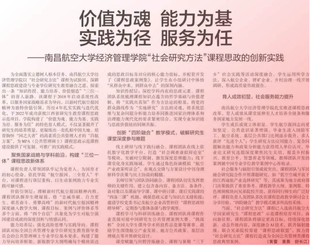 《中国教育报》报道我校经济管理学院以“社会研究方法”课程为试验田,深耕课程思政建设与专业学位研究生教育融合之道,探索出一条“知识传授、能力培养、价值塑造”“三位一体”的育人新路。