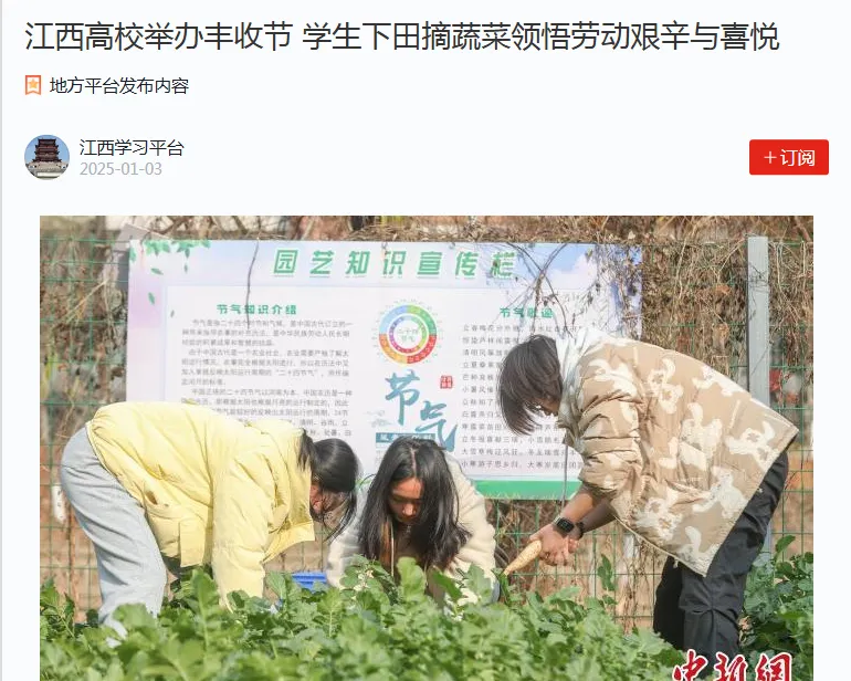 《学习强国》报道我校举行《园艺课堂》第二届丰收节活动,学生们下田采摘萝卜和其他蔬菜,领悟劳动的艰辛和丰收的喜悦。