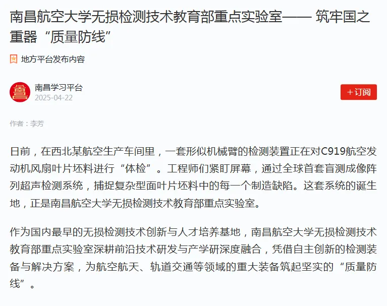 《学习强国》报道我校无损检测技术教育部重点实验室深耕前沿技术研发与产学研深度融合,凭借自主创新的检测装备与解决方案,为航空航天、轨道交通等领域的重大装备筑起坚实的“质量防线”。