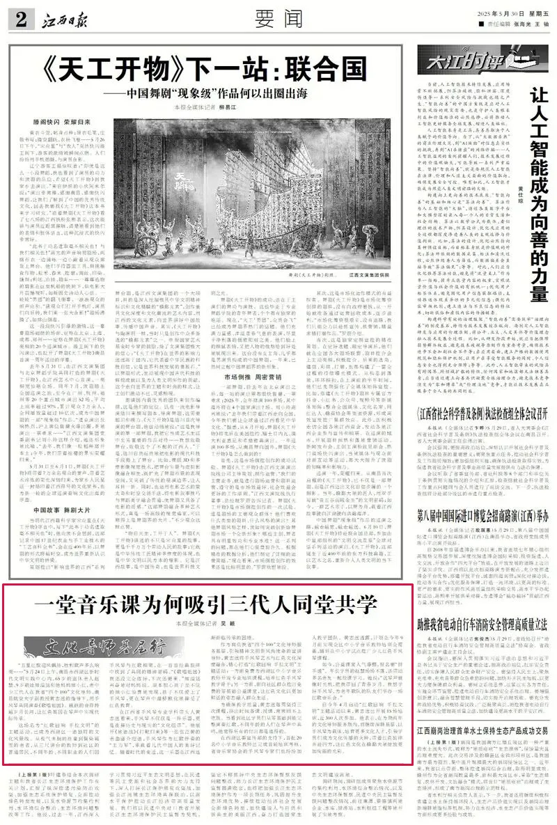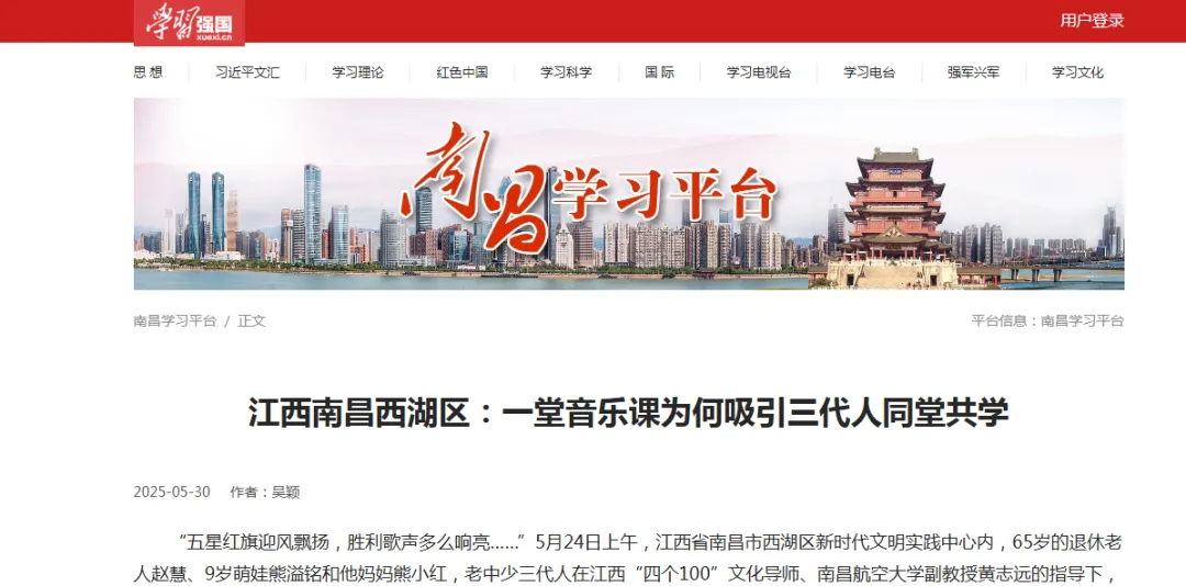 《学习强国》报道老中少三代人在江西“四个100”文化导师、我校副教授黄志远的指导下,用手风琴共同演奏《歌唱祖国》。跳跃的音符跨越岁月长河,让红色基因在琴声中实现代际传承。