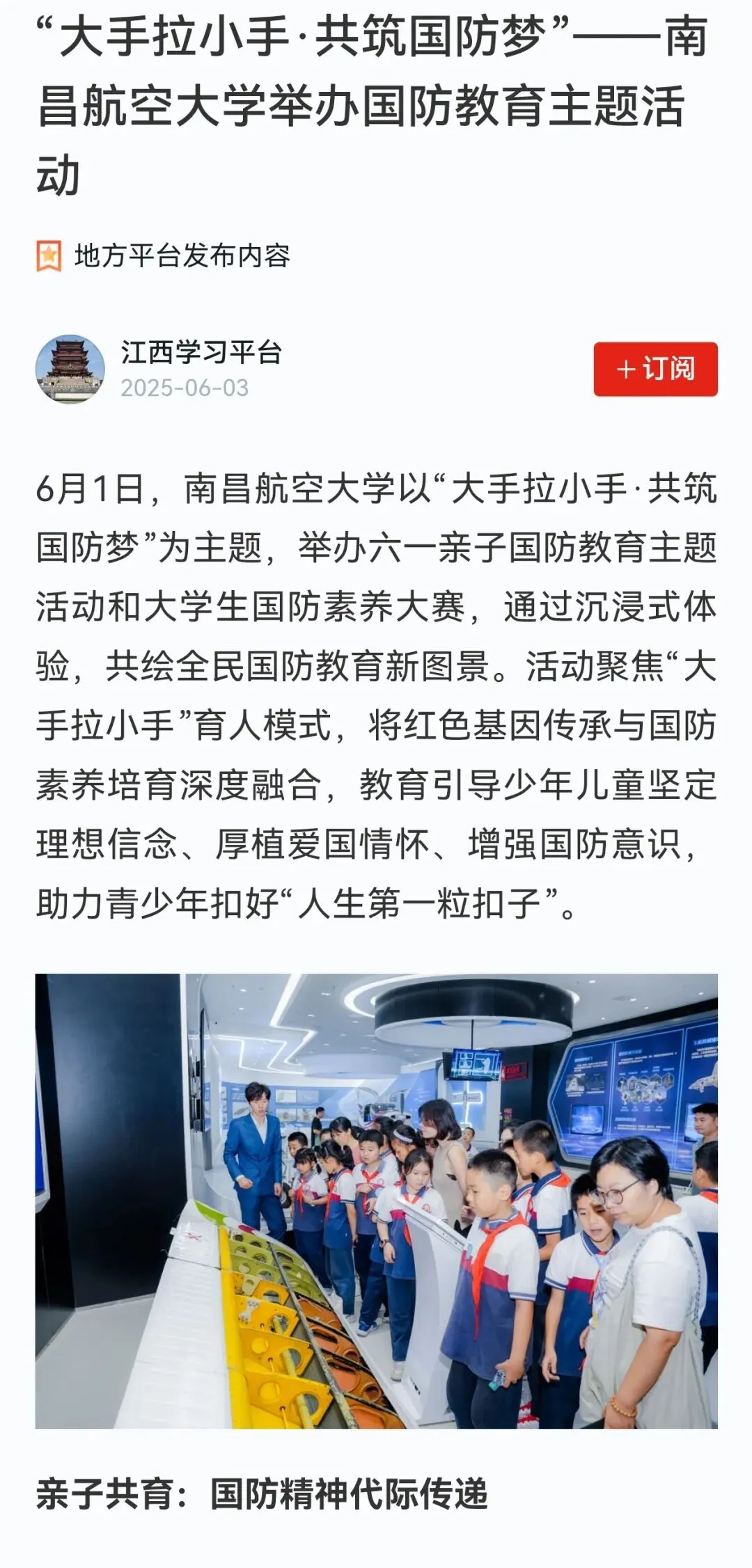 《江西日报》报道我校以“大手拉小手·共筑国防梦”为主题,举办六一亲子国防教育主题活动和大学生国防素养大赛