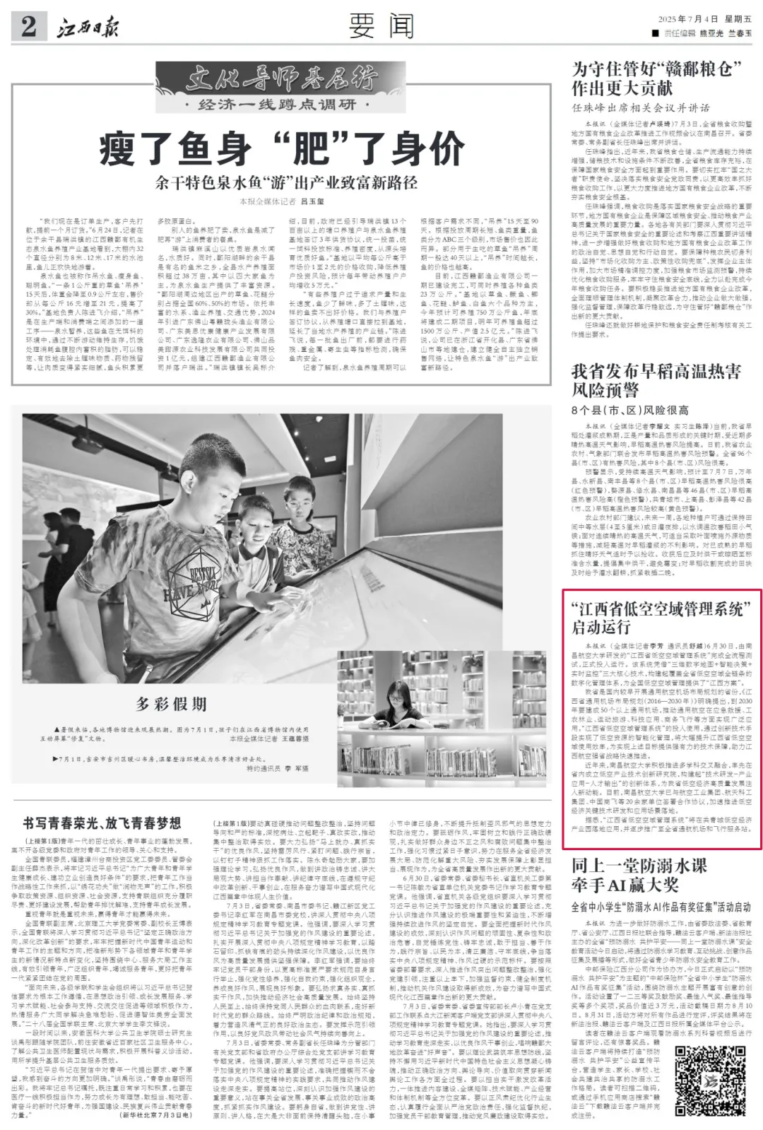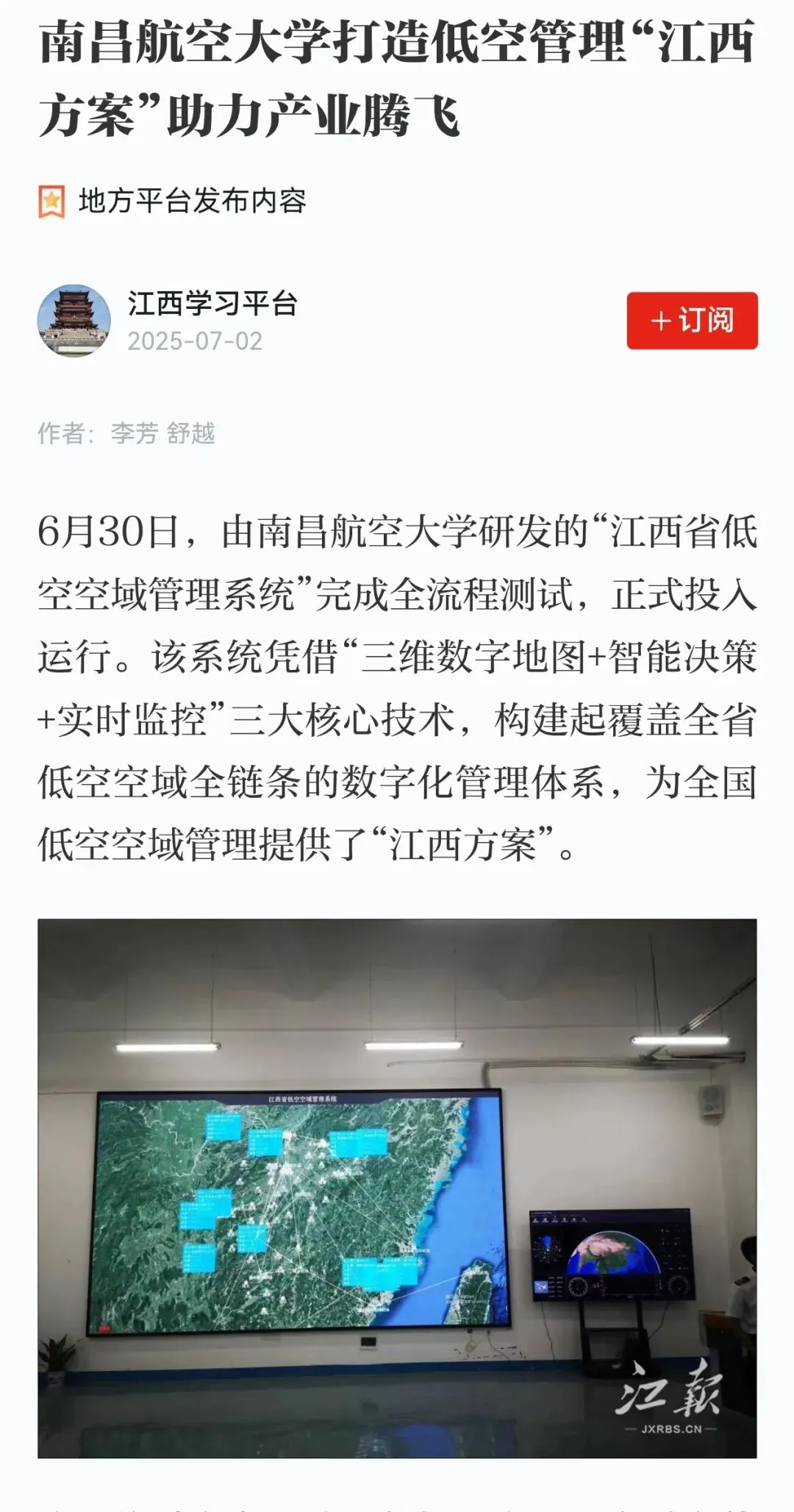 《江西日报》报道由我校研发的“江西省低空空域管理系统”完成全流程测试并正式运行。该系统以“三维数字地图+智能决策+实时监控”三大核心技术,搭建起覆盖江西省低空空域全链条的数字化体系,为全国低空空域管理提供了“江西方案”。