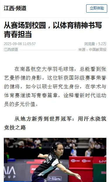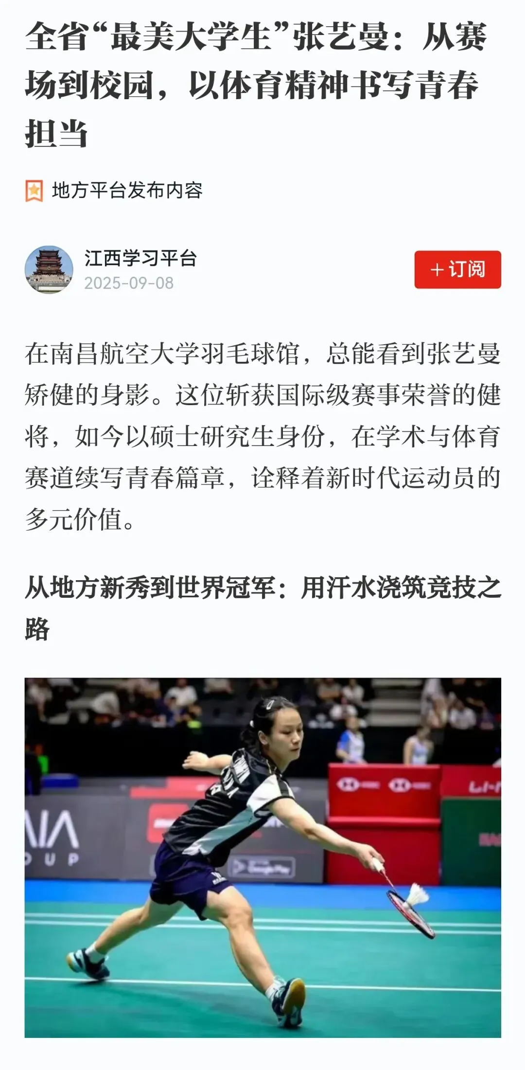 《学习强国》报道斩获国际级赛事荣誉的健将张艺曼以硕士研究生身份,在学术与体育赛道续写青春篇章,诠释着新时代运动员的多元价值。