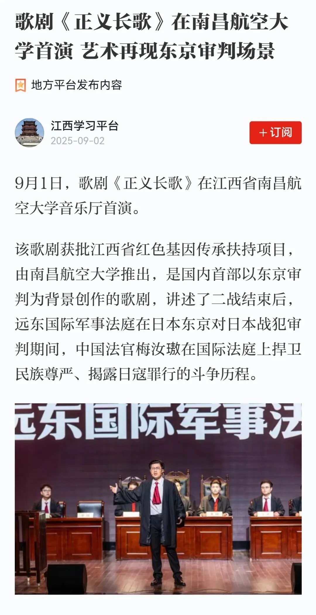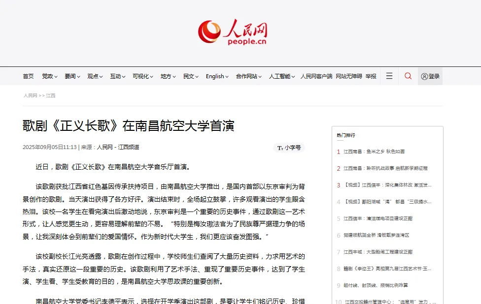 《人民网》报道我校歌剧《正义长歌》在学校音乐厅首演。