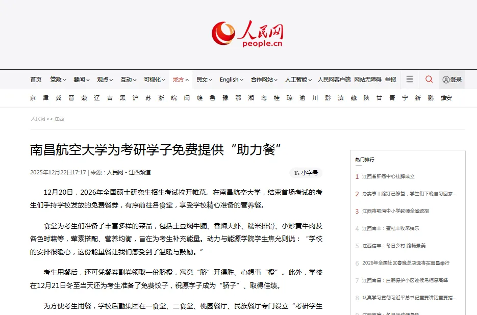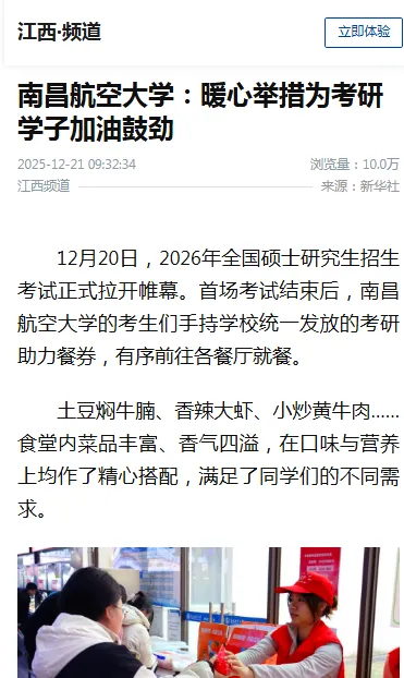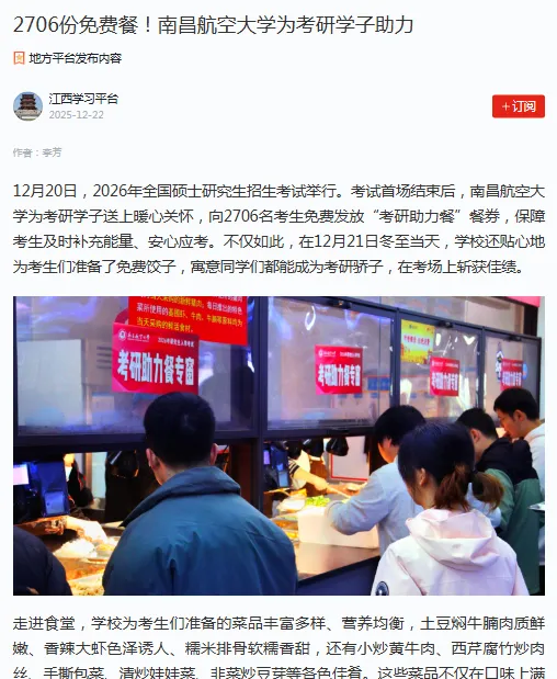《江西教育电视台》报道我校为考研学子送上暖心关怀,向2706名考生免费发放“考研助力餐”餐券,保障考生及时补充能量、安心应考。