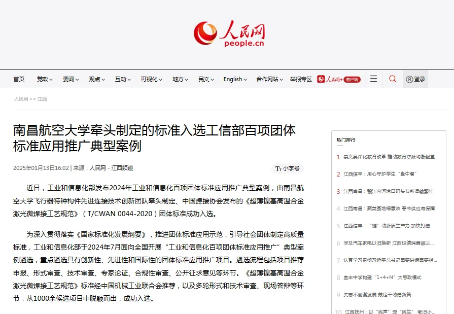 《人民网》报道我校飞行器特种构件先进连接技术创新团队牵头制定、中国焊接协会发布的《超薄镍基高温合金激光微焊接工艺规范》(T/CWAN 0044-2020)团体标准成功入选2024年工业和信息化百项团体标准应用推广典型案例。