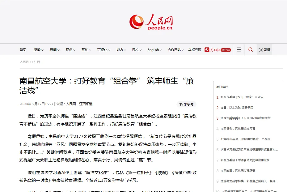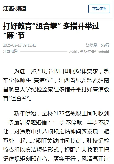 《新华社客户端》报道我校江西省纪委监委驻南昌航空大学纪检监察组紧扣“廉洁教育不断线”的理念,有序组织开展了一系列工作,打好廉洁教育“组合拳”。