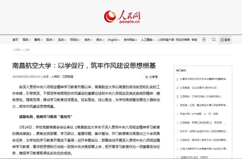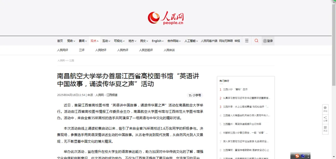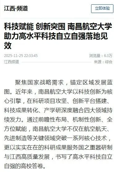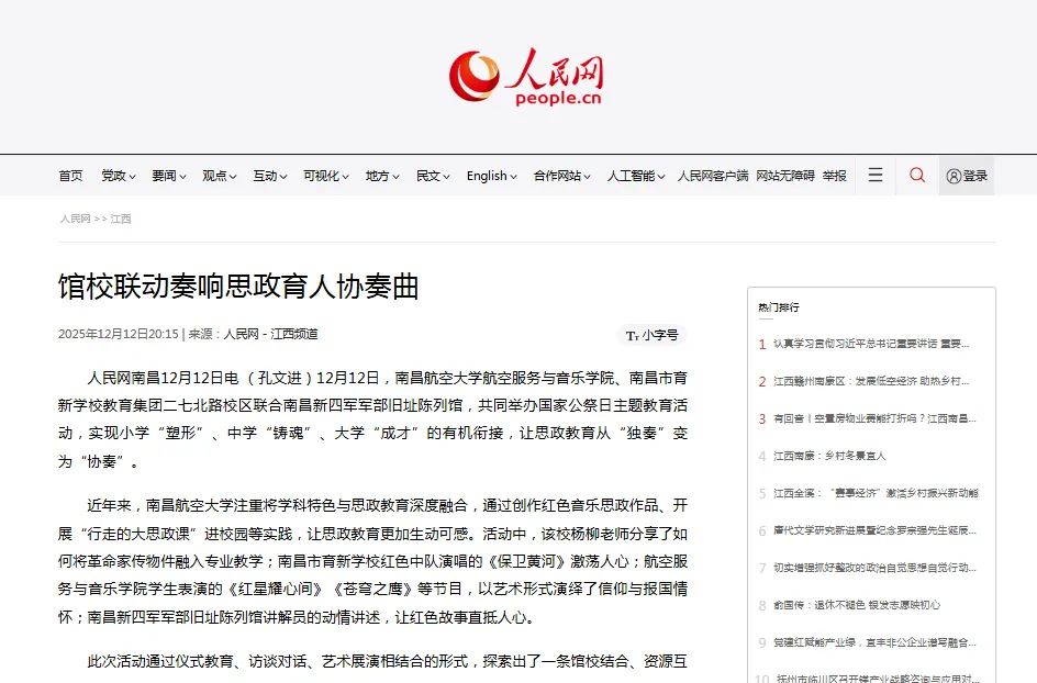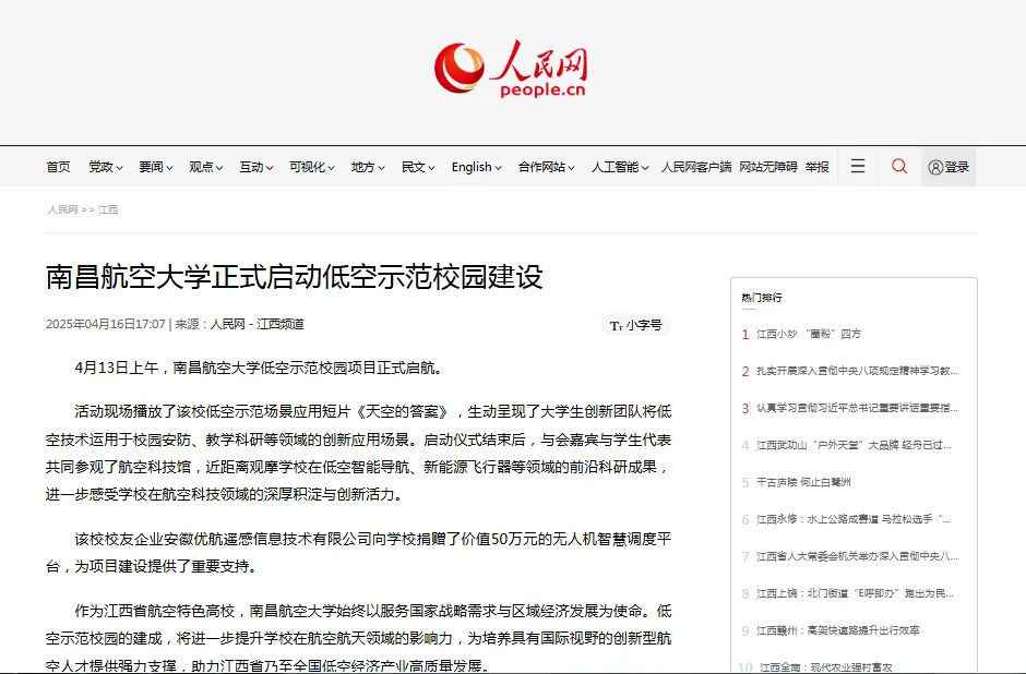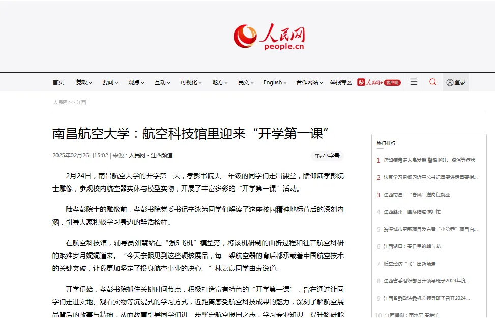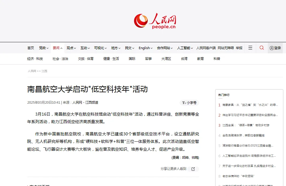 《人民网》报道我校在航空科技馆启动"低空科技年"活动,通过科普讲座、创新竞赛等全年系列活动,助力江西低空经济高质量发展。