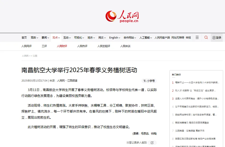 《人民网》报道我校师生开展了春季义务植树活动。校领导与学校师生代表一道,以实际行动践行绿色发展理念,为建设美丽校园贡献力量。