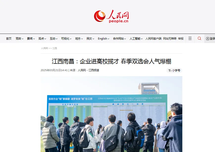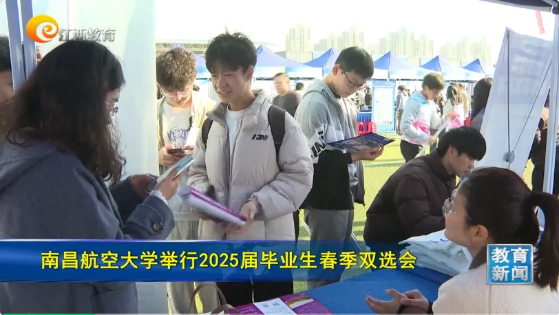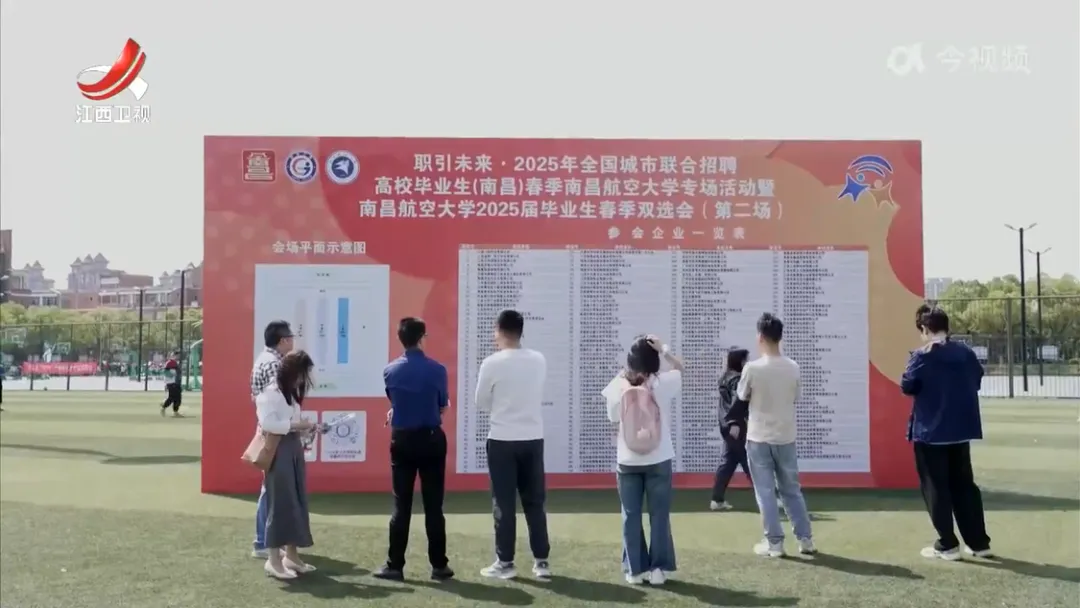《江西教育电视台》报道江西省2025届高校毕业生“1269”行动计划重点产业链系列招聘会(航空产业链专场)暨南昌航空大学2025届毕业生春季双选会举办。320家企业参加,提供近1.2万个岗位,涵盖航空、电子、智能制造等多个领域。