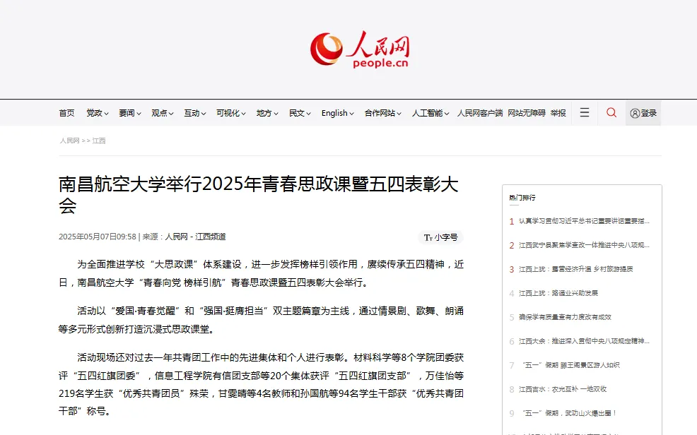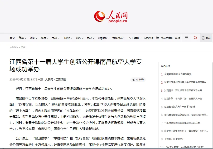 《人民网》报道江西省第十一届大学生创新公开课南昌航空大学专场成功举办。