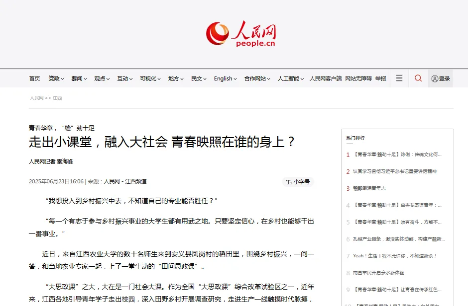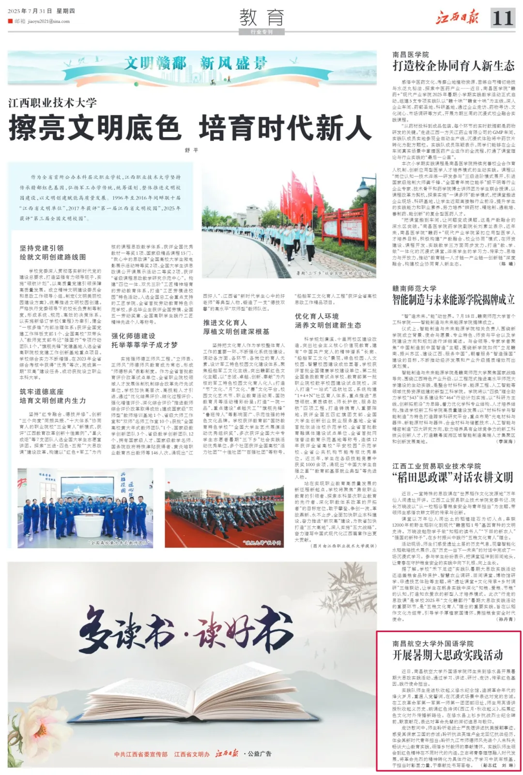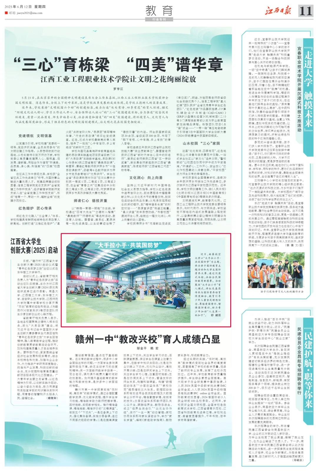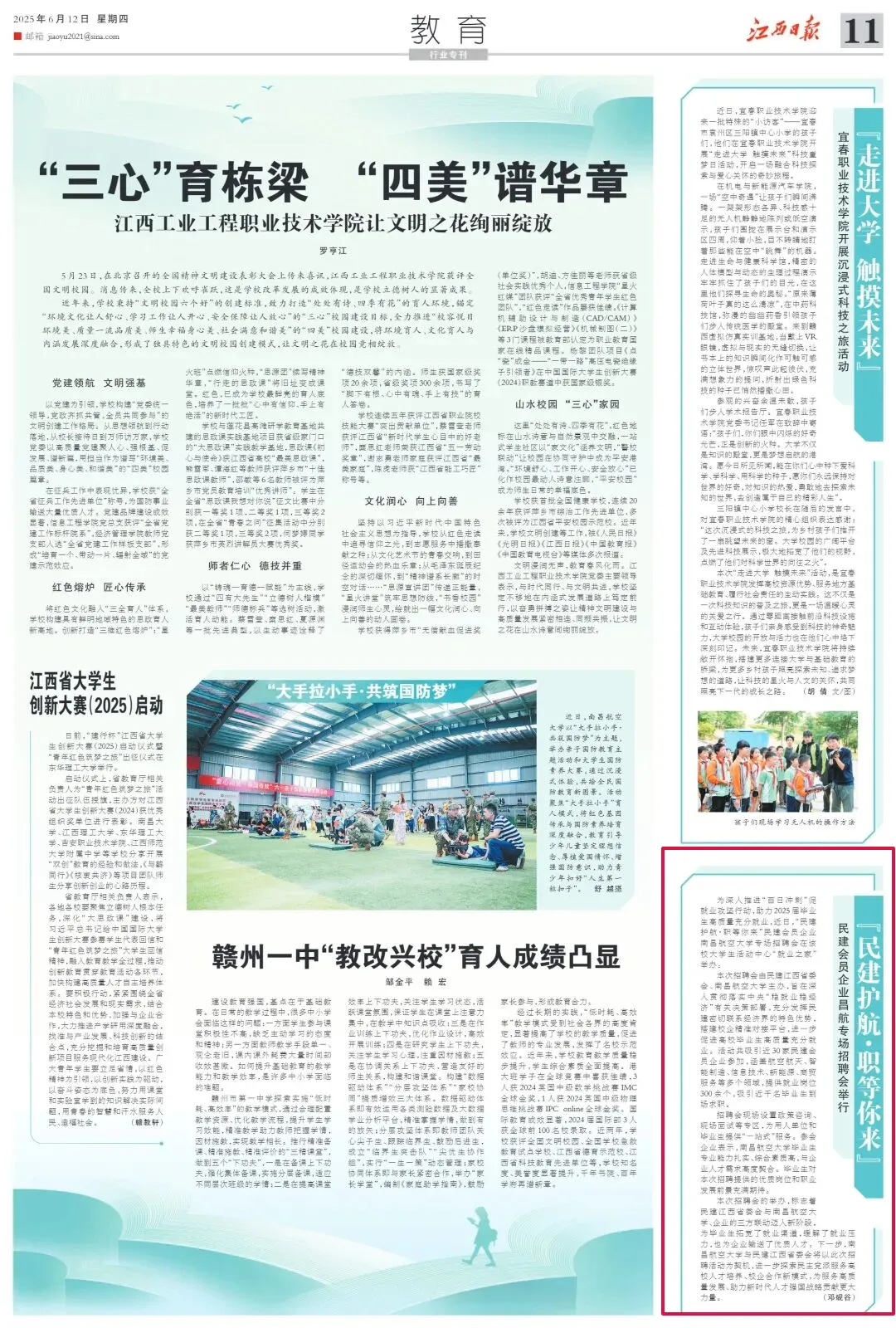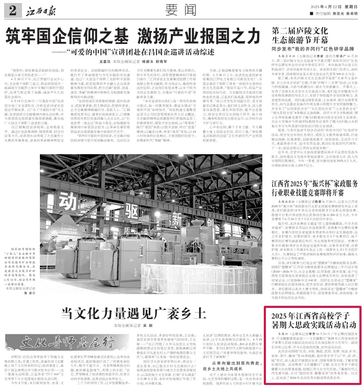 《江西日报》报道“牢记嘱托强国有我 行走赣鄱感恩奋进——文化赣鄱行”2025年江西高校学子暑期大思政实践活动启动仪式在我校举行。副省长孙洪山出席,并为示范高校授旗,宣布活动启动。
