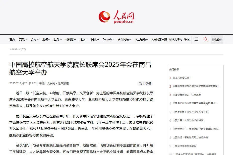 《人民网》报道以“低空启航、AI赋能、开放共享、交叉创新”为主题的中国高校航空航天学院院长联席会2025年会在我校举办。