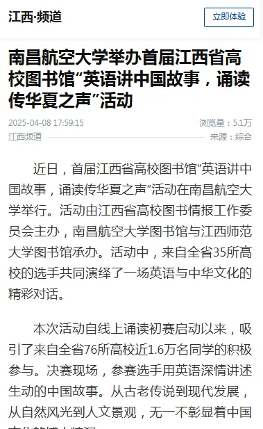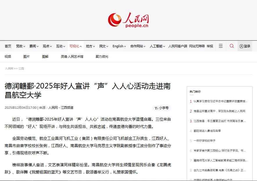 《江西教育电视台》报道由中共江西省委宣传部、江西省文明办主办的“德润赣鄱·2025年好人宣讲‘声’入人心”活动在南昌航空大学举行。