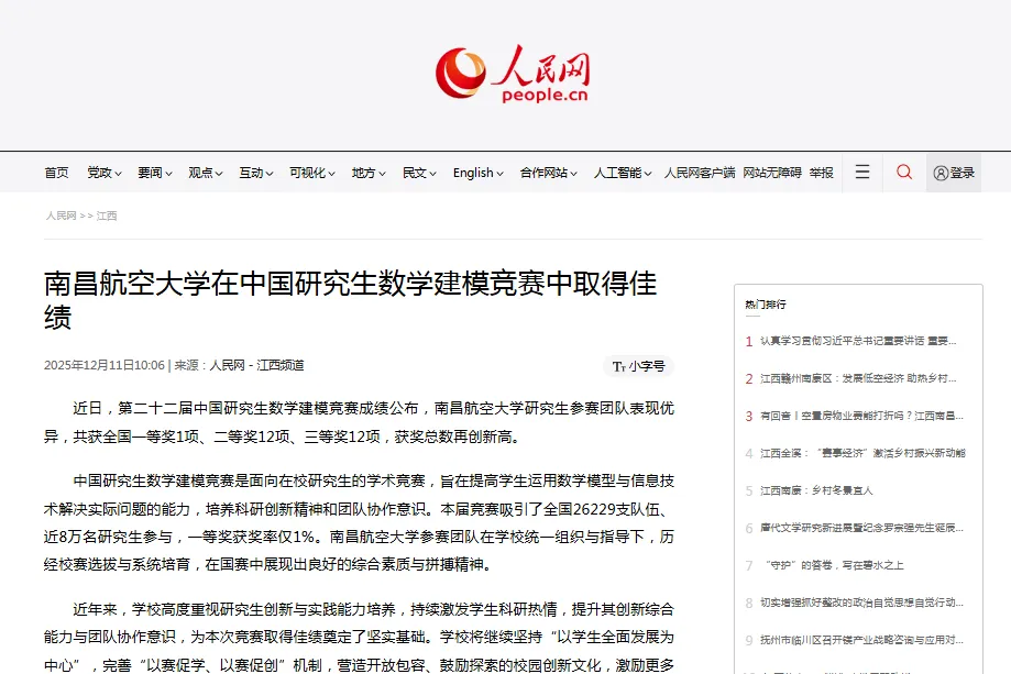 《人民网》报道我校研究生参赛团队表现优异,共获第二十二届中国研究生数学建模竞赛全国一等奖1项、二等奖12项、三等奖12项,获奖总数再创新高。