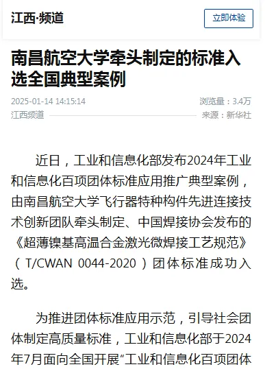 《新华社客户端》报道我校飞行器特种构件先进连接技术创新团队牵头制定、中国焊接协会发布的《超薄镍基高温合金激光微焊接工艺规范》(T/CWAN 0044-2020)团体标准成功入选2024年工业和信息化百项团体标准应用推广典型案例。