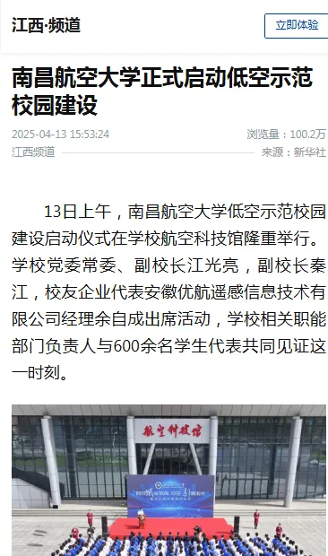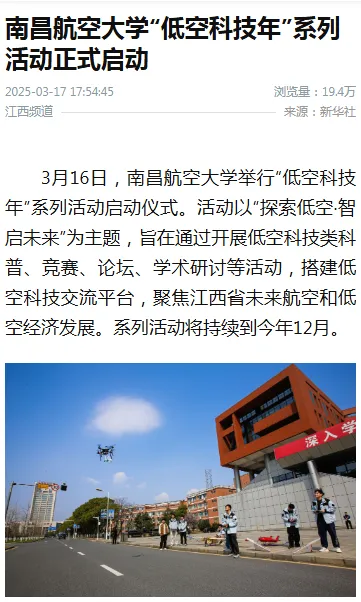 《新华社客户端》报道我校举行“低空科技年”系列活动启动仪式。活动以“探索低空·智启未来”为主题,旨在通过开展低空科技类科普、竞赛、论坛、学术研讨等活动,搭建低空科技交流平台,聚焦江西省未来航空和低空经济发展。