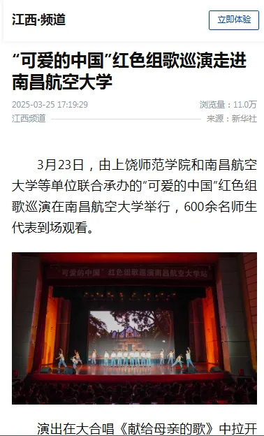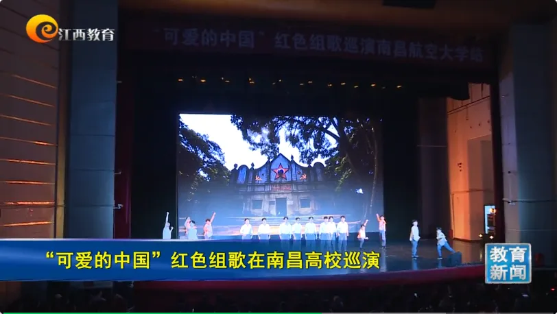 《江西教育电视台》报道由中共江西省委教育工委、九三学社江西省委员会和中共上饶市委联合主办,上饶师范学院和南昌航空大学等单位联合承办的“可爱的中国”红色组歌巡演在我校大学生活动中心礼堂举行。