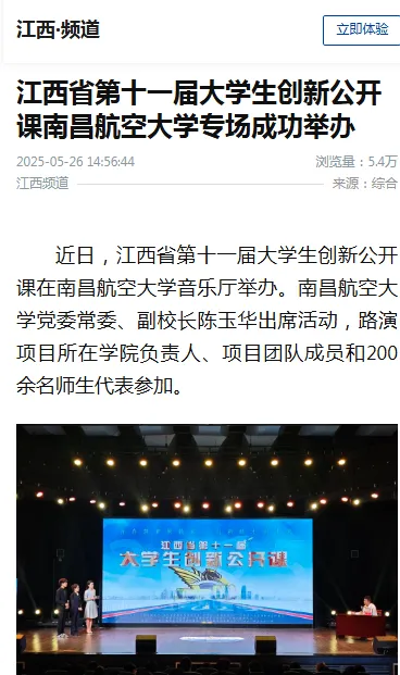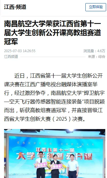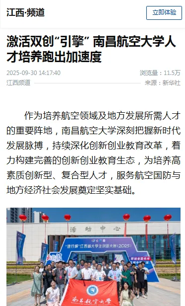 《新华社客户端》报道我校“焊卫航宇—空天飞行器传感器智能连接装备”项目在江西省第十一届大学生创新公开课决赛脱颖而出,斩获高教组赛道冠军,并直接晋级江西省大学生创新大赛(2025)决赛。