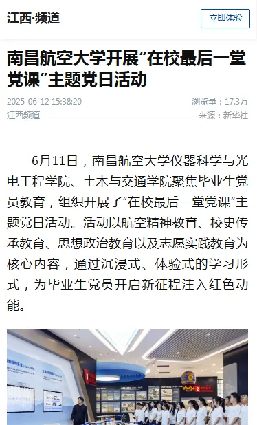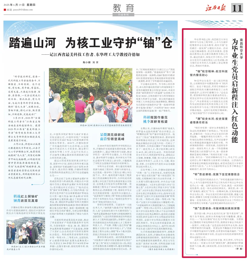 《江西日报》报道我校南昌航空大学仪器科学与光电工程学院、土木与交通学院聚焦毕业生党员教育,组织开展了“在校最后一堂党课”主题党日活动。