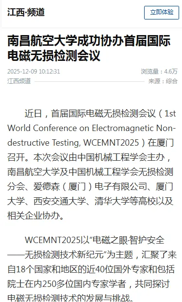《新华社客户端》报道首届国际电磁无损检测会议(1st World Conference on Electromagnetic Non-destructive Testing, WCEMNT2025)由中国机械工程学会主办,我校及中国机械工程学会无损检测分会、爱德森(厦门)电子有限公司、厦门大学、西安交通大学、清华大学等高校以及相关企业协办。