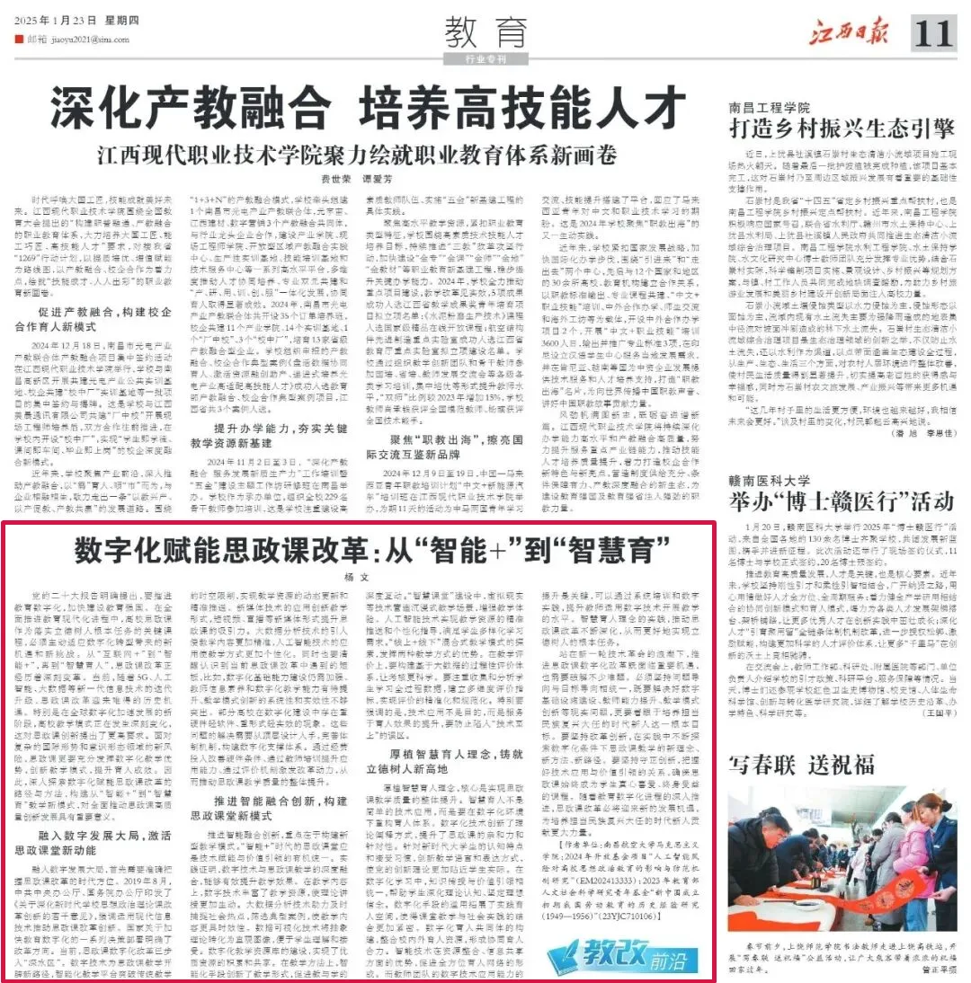 《江西日报》报道我校马克思主义学院教师文章:《数字化赋能思政课改革:从“智能+”到“智慧育”》