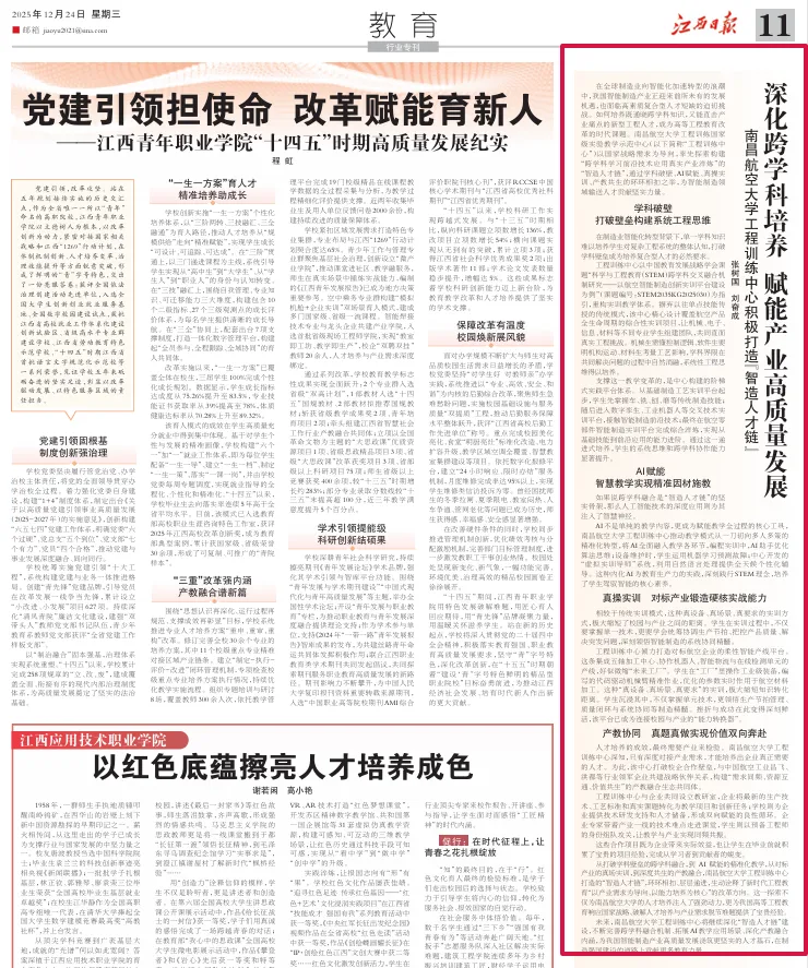 《江西日报》报道我校我校工程训练国家级实验教学示范中心以国家战略需求为导向,率先探索构建“跨学科学习前沿技术应用真实产业淬炼”的“智造人才链”,通过学科破壁、AI赋能、真操实训、产教共生的环环相扣之举,为智能制造领域输送人才贡献坚实力量。