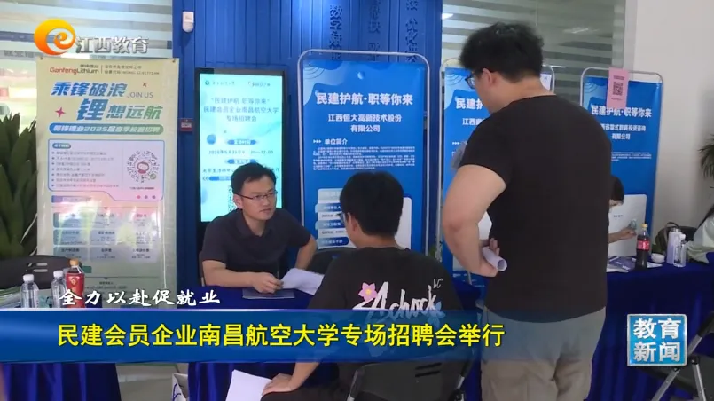 《江西教育电视台》报道我校“民建护航·职等你来”民建会员企业专场招聘会在南昌航空大学举行,近千名毕业生到现场参加招聘。