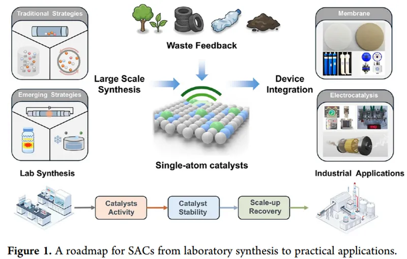 图1:SACs从实验室合成到实际应用的路线图:明确了SACs工业化的核心链路为“实验室合成→规模化制备(传统+新兴策略)→绿色原料提取及回收→器件集成(膜、电催化器件)→工业应用”,直观展现了各环节的核心关联与关键目标。