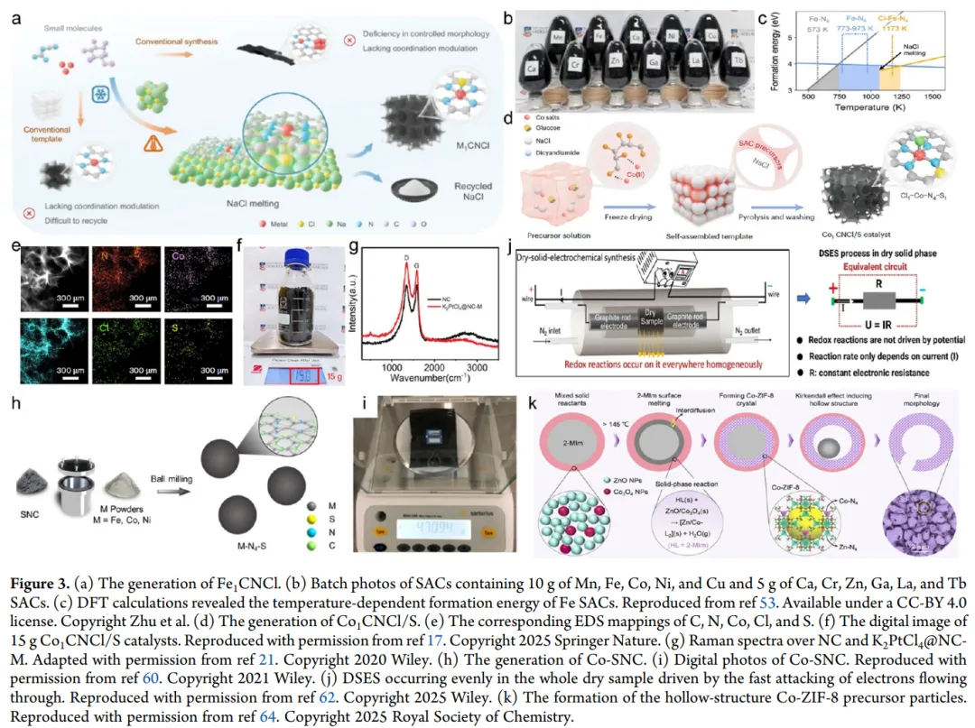 首次系统整合SACs传统规模化合成策略(热解、熔盐模板、球磨)与新兴技术(焦耳加热、微波加热、低温合成),对比分析各方法的合成条件、适用体系、核心优势与局限性,解析了不同策略调控金属原子分散状态、配位结构的关键机制。
