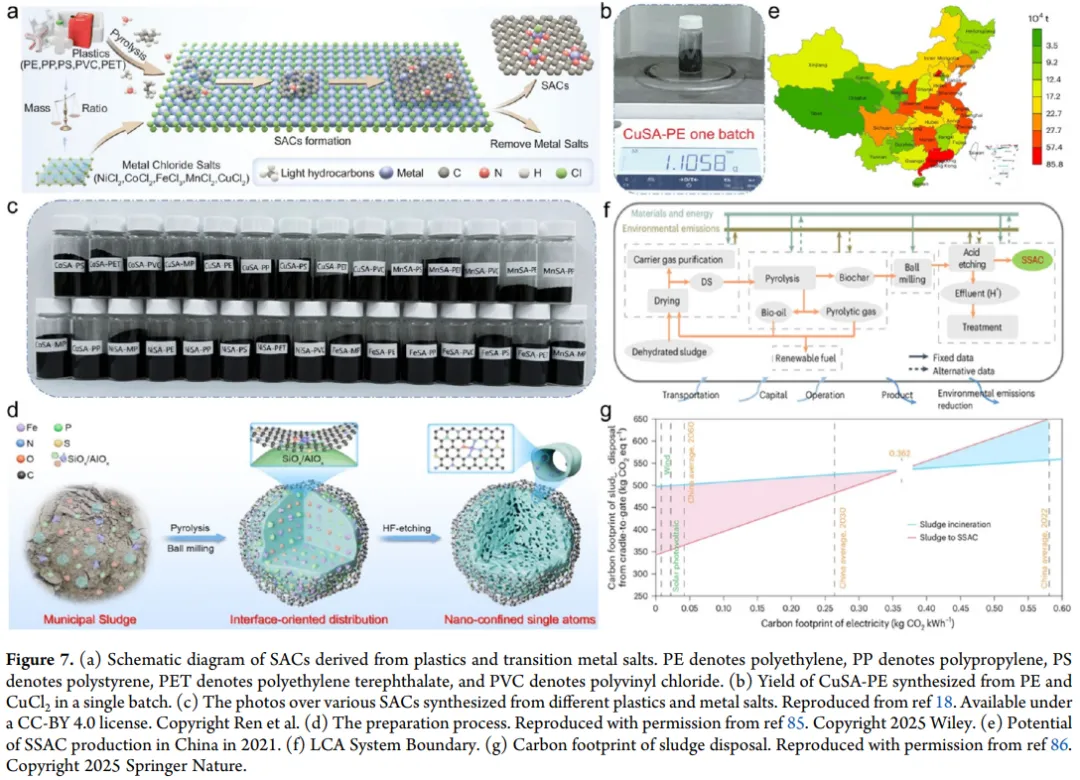 图7:废弃物基SACs合成图:展示了以塑料、污泥为原料的绿色合成工艺,利用熔盐模板法将聚乙烯、聚丙烯等废塑料转化为SACs,碳转化率达88%,将市政污泥转化为Fe-N3O单原子催化剂,生命周期评估显示该路径较传统污泥焚烧大幅降低环境影响,实现了环境与经济双重效益。