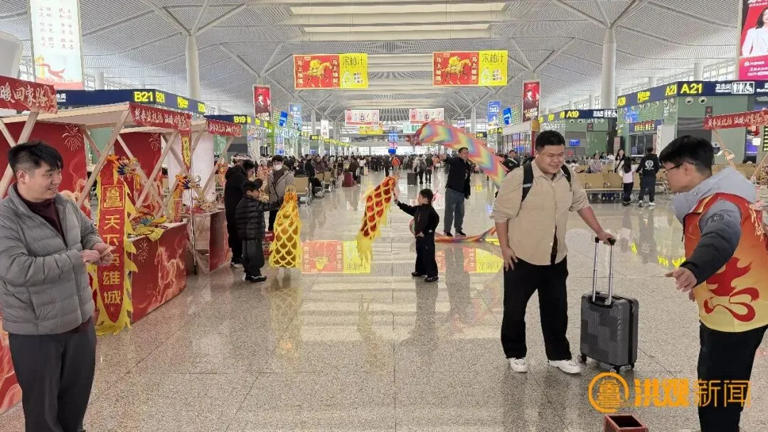 2月10日,在南昌西站,热闹喜庆的城南龙灯彩带龙表演正在上演,为回家的旅客送上新春的祝福。