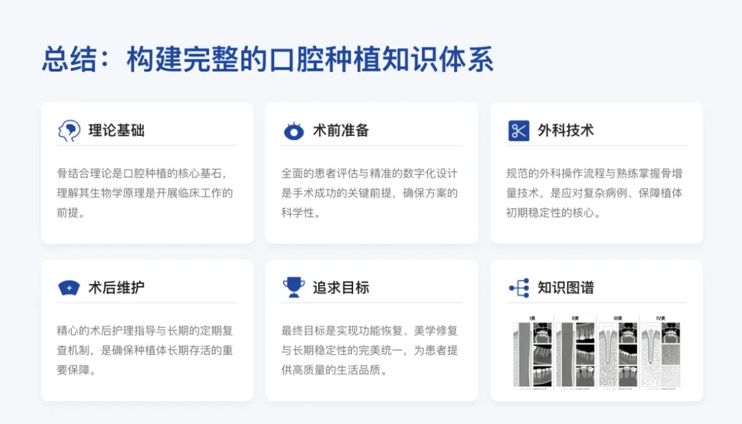 课程开篇从口腔种植概论与发展史切入,清晰回顾了口腔种植技术从起源探索到现代成熟应用的完整历程,让参训人员对种植技术的发展脉络形成系统认知;随后深入解析口腔解剖学基础,结合临床实例拆解种植“土壤”——牙槽骨的关键结构与生理特点,帮助医师精准把控种植手术的核心解剖要点;紧接着聚焦种植材料学与表面处理技术,细致探讨种植体材质选择、表面处理工艺与生物相容性的核心关联,为临床材料选用提供科学指引。