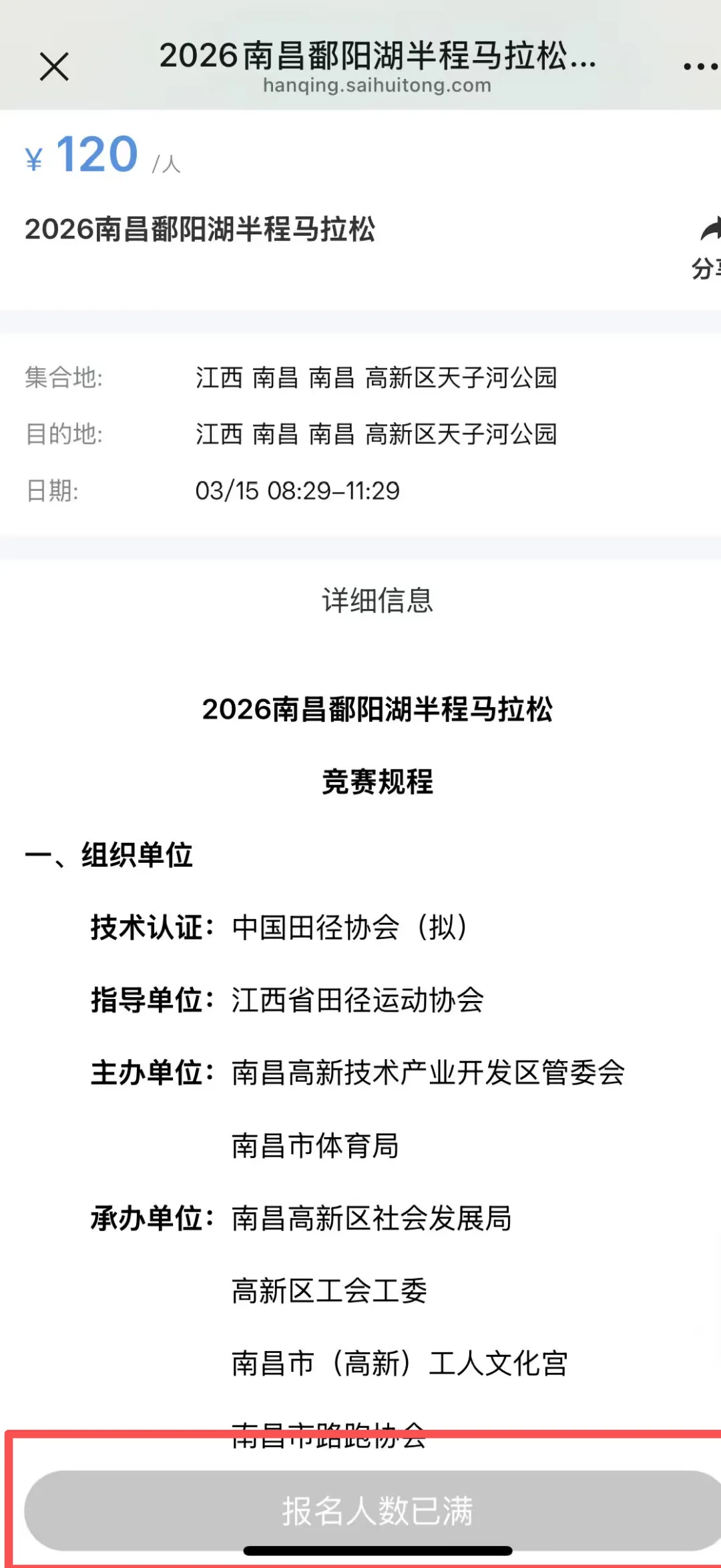 跑友沸腾!刷屏预警📣 中国田协认证赛事——2026南昌鄱阳湖半程马拉松,报名通道昨日(2月14日)10:00正式开启,热度直接拉满,不足24小时,4000个名额全部报满,用火爆实力印证“醉美生态赛道”的超强吸引力!
