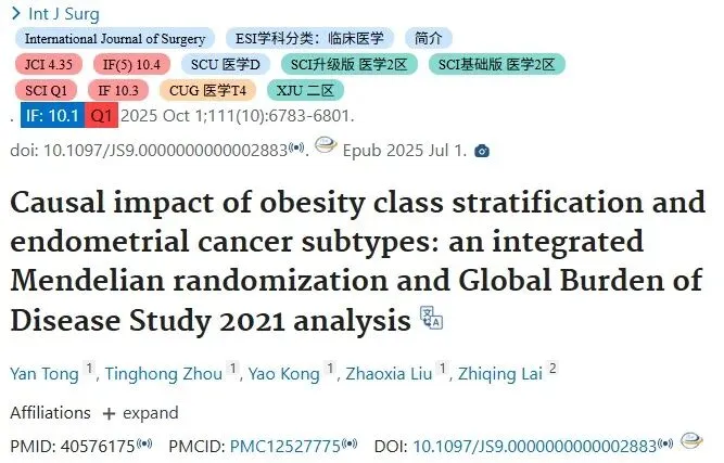 南昌大学重磅发布💣!南昌大学第二附属医院童艳团队联合多机构,于 2025 年 7 月在📘《International Journal of Surgery》发表肥胖与子宫内膜癌相关重磅成果。该研究整合 GBD 2021 数据与孟德尔随机化分析,纳入全球 204 国 30 年疾病负担数据及基因组学样本,锁定 BMI≥30 kg/m² 为核心风险因素。研究证实 I 级肥胖(BMI 30-34.9)使子宫内膜样癌风险升高 27%,且肥胖分级与该亚型呈剂量依赖关系,而与非子宫内膜样亚型无显著关联,同时预测 2036 年相关疾病负担将持续上升。该成果为细化癌症筛查阈值、制定区域化肥胖干预策略提供了关键依据,对降低高 SDI 地区及老年人群患病风险具有重要意义。