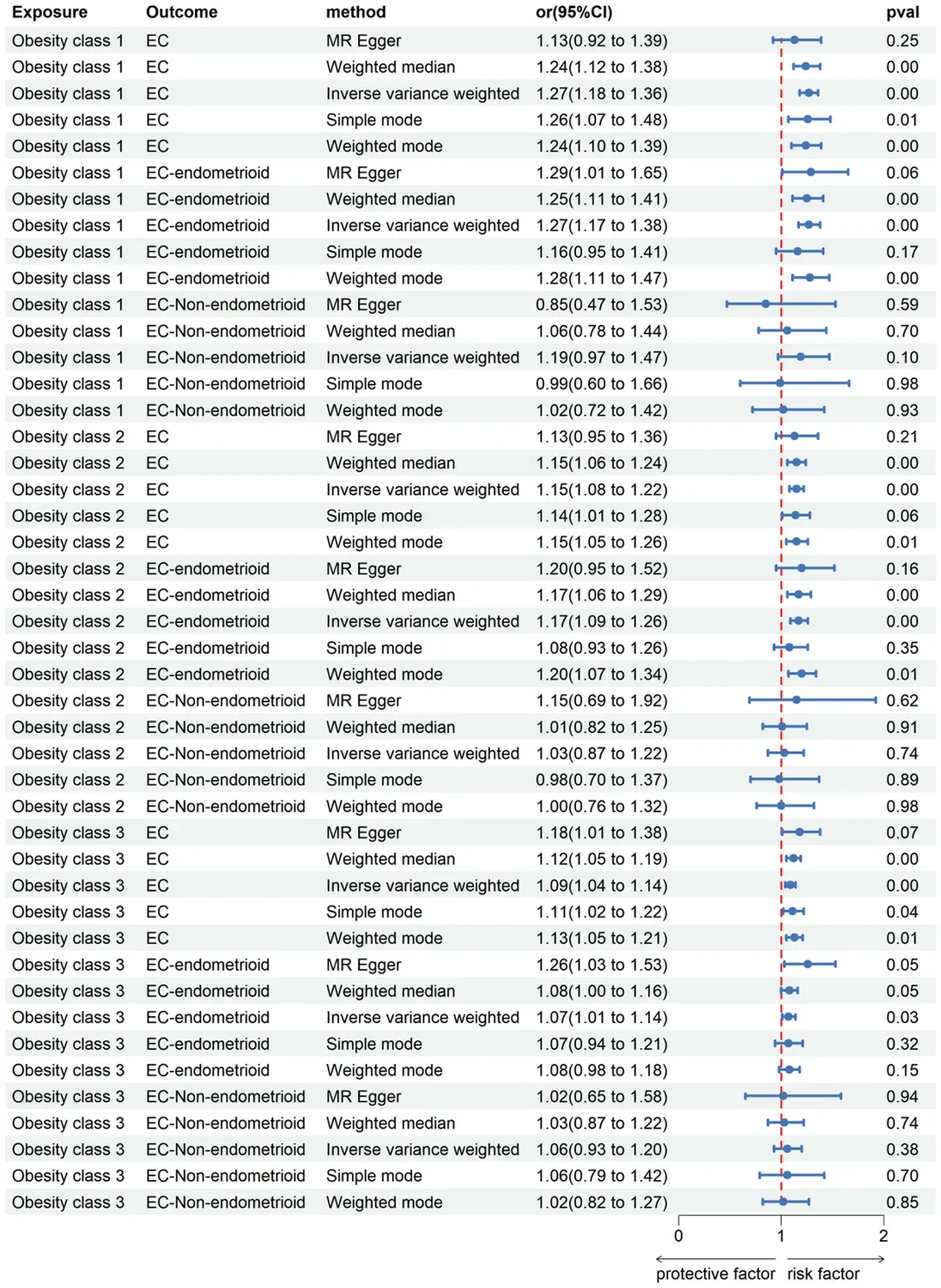 图6 孟德尔随机化(MR)估计肥胖类别对子宫内膜癌亚型的因果关系