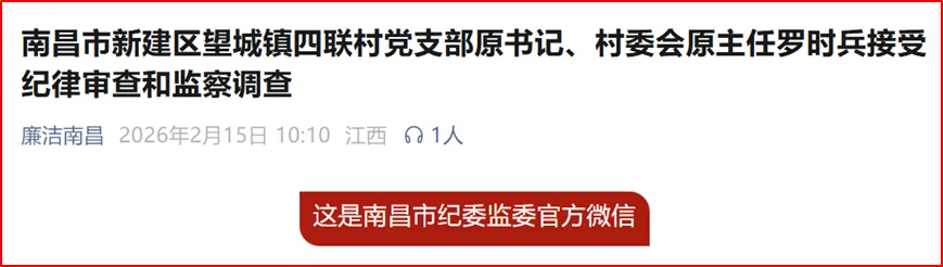2026年2月15日,南昌市纪委监委官方微信“廉洁南昌”发布消息,南昌市新建区望城镇四联村党支部原书记、村委会原主任罗时兵涉嫌严重违纪违法,主动向组织交代问题,目前正接受南昌市新建区纪委监委纪律审查和监察调查。