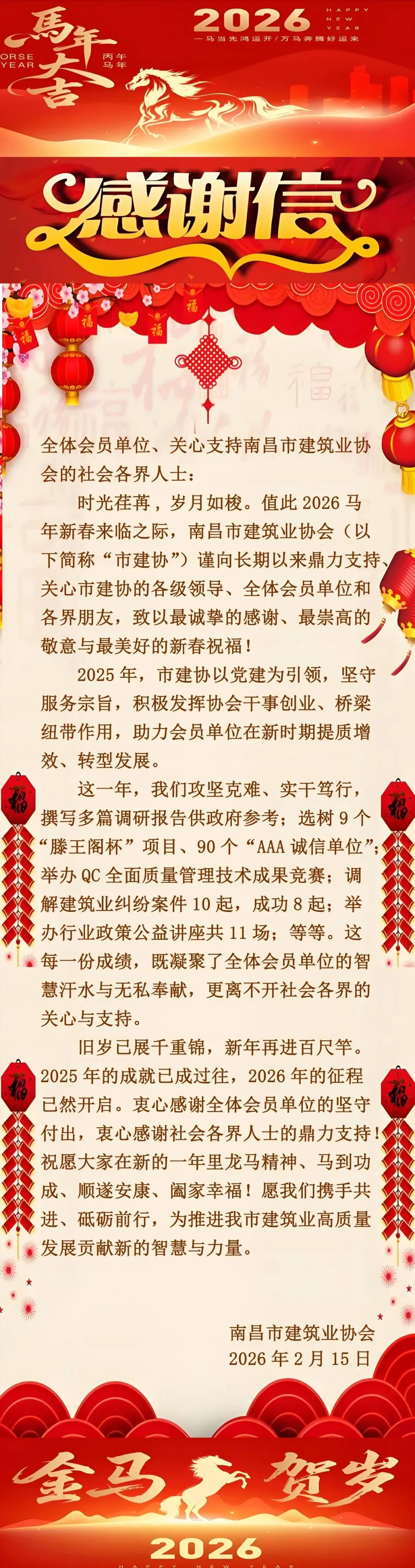 南昌市建筑业协会致全体会员单位及关心支持协会工作各界人士的新春感谢信