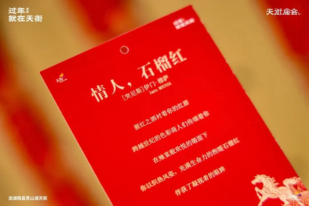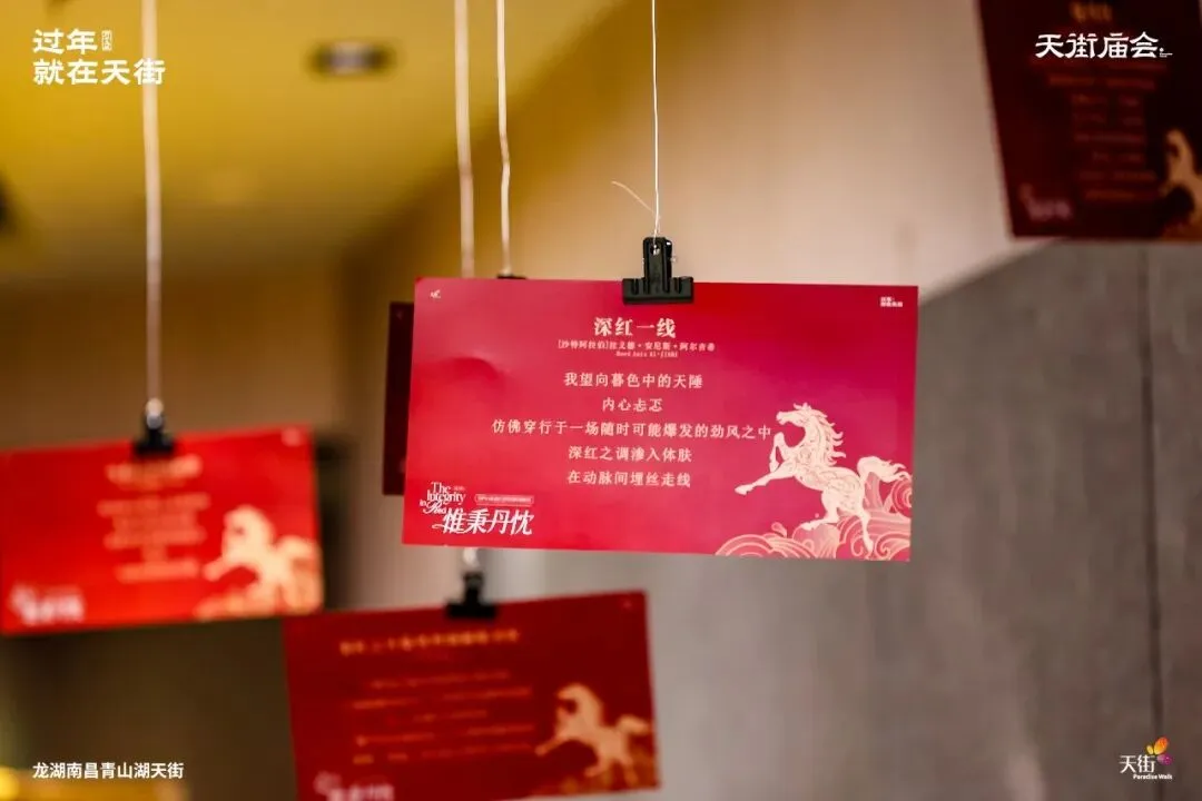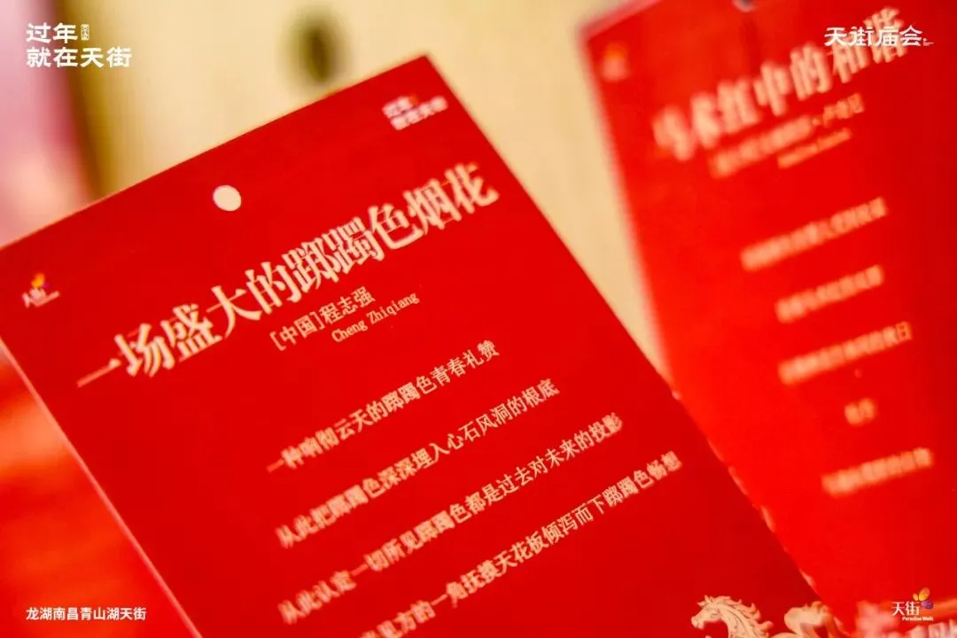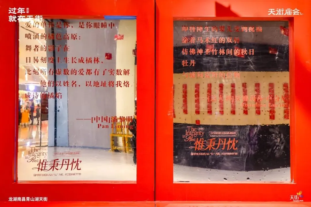 💝惟秉丹忱:百科诗派诸红迎春国际邀请展💖The Integrity in Red: Encyclopedic Poetry School's International Invitational Exhibition💗时间:2026年2月14日起🌹地点:龙湖南昌青山湖天街A-1F🍷商业简介:龙湖南昌青山湖天街是江西首座天街项目,2022年8月19日正式开业,总建筑面积12.6万平方米,商业总租赁面积5.4万平方米。地处南昌城东青山湖区解放东路与高新南大道交会处,主要规划有超市、品质服饰、潮牌、数码、美妆、KTV、儿童游乐、影院、各类餐饮等业态。项目位于地铁2号线李家巷站,采用了“商业+街区+文化”的模式,融合了洪都传统文化、现代潮流元素与多元文化体验。 通过建筑设计、历史建筑活化、特色文化活动以及传统节庆非遗体验等方式,营造文化氛围和城市记忆空间。