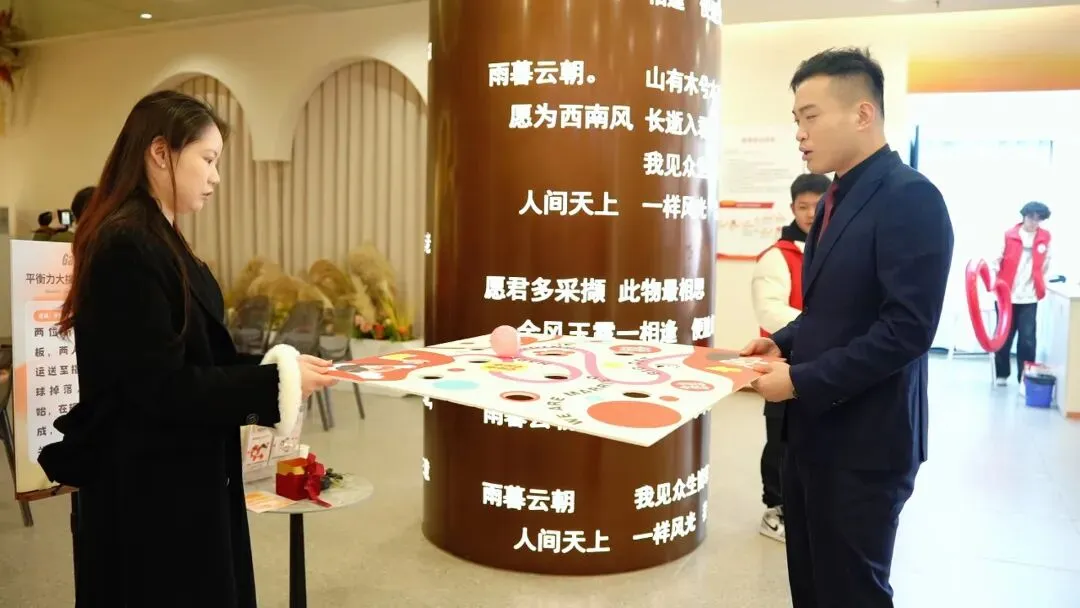 活动现场布置简洁温馨,处处透着喜庆。工作人员早早到位,有条不紊引导新人办理登记手续、解答疑问,用贴心服务为新人们的幸福旅程保驾护航。此次活动特意准备了“甜蜜暴击”“平衡力大挑战”“喜乐拼”等3个趣味小游戏,新人们携手参与、抽取礼品,在欢声笑语中定格甜蜜瞬间。