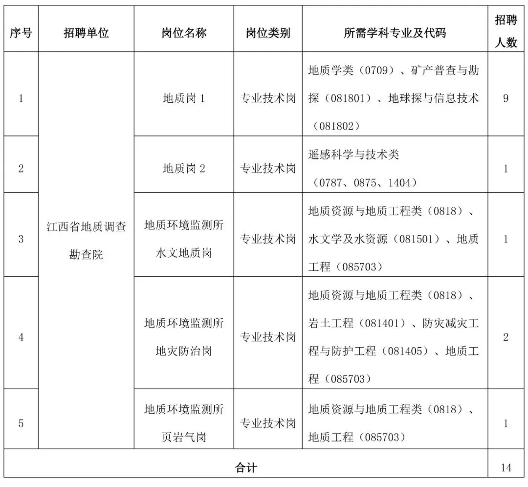 博士招聘计划共14名,具体招聘岗位及要求详见《江西省地质局局属事业单位2026年高层次人才招聘岗位表》(附件1)。