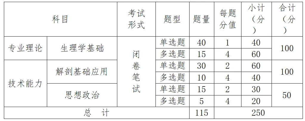 依据专业培养要求,分为专业理论和技术能力测试两部分(合卷),总分为250分。专业理论考试科目为生理学基础(100分),技术能力考试科目为解剖基础应用(100分)、思想政治(50分)。
