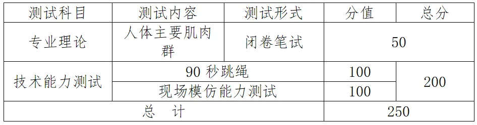 体育类健身指导与管理专业考生参加线下技能校考,总分为250分,详见附件。