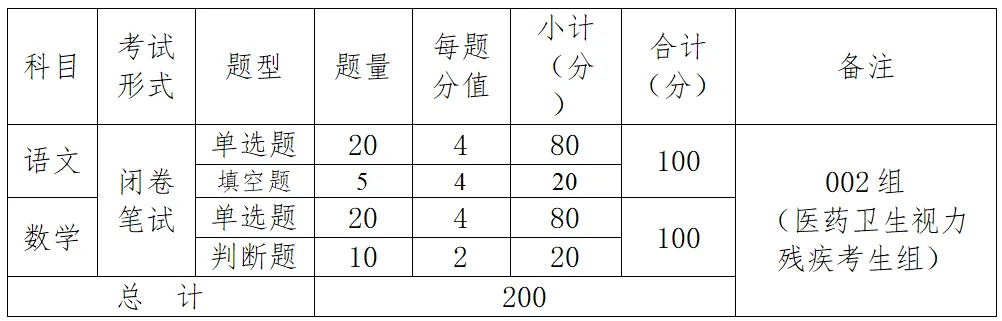 文化校考的对象为完成报名的视力残疾考生,即002组(医药卫生视力残疾考生组)。考试科目为语文、数学,满分每科各100分,总分200分。